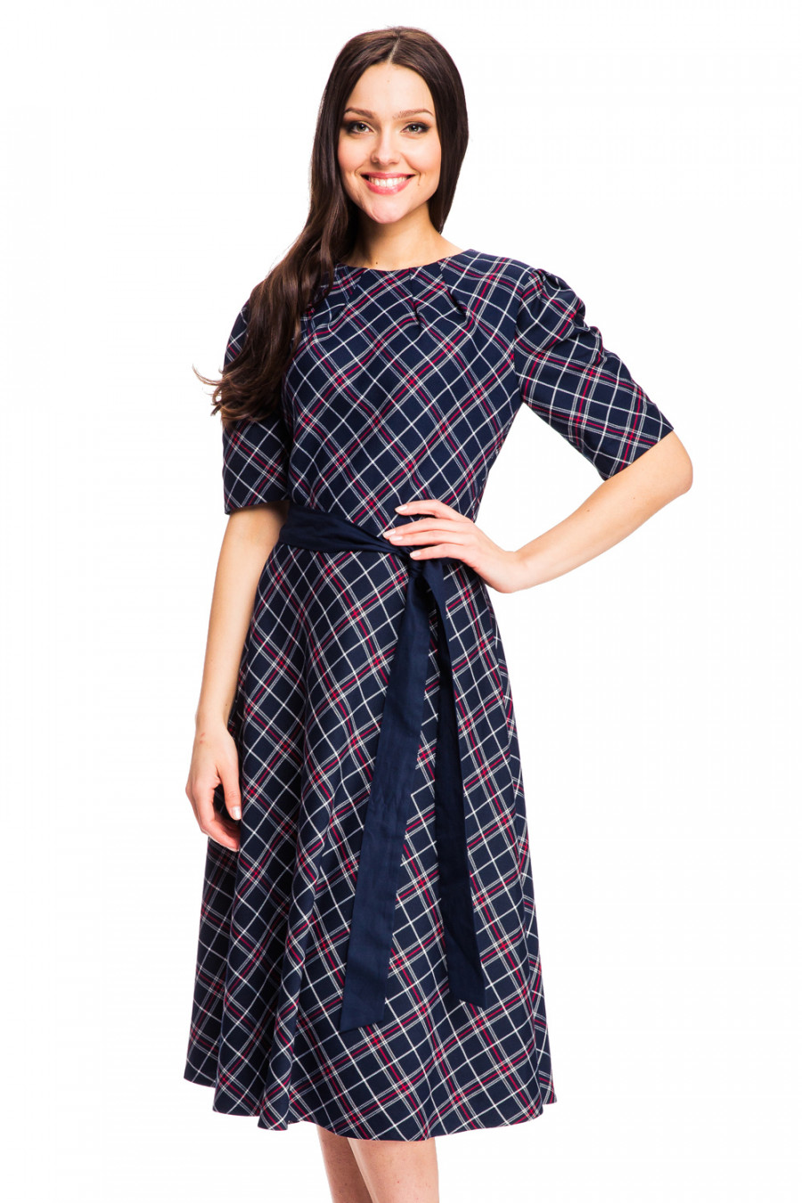 Стильное платье с округлым воротом горловины и короткими рукавами. Модель оригинального кроя и приталенного силуэта, нижняя часть-расклешенная юбка. Талия разделена тонким поясом. По линии ворота и рукавов имеются небольшие сборки. Выполнено из ткани костюмной группы с принтом в диагональную клетку. Сзади-застёжка на молнию.
