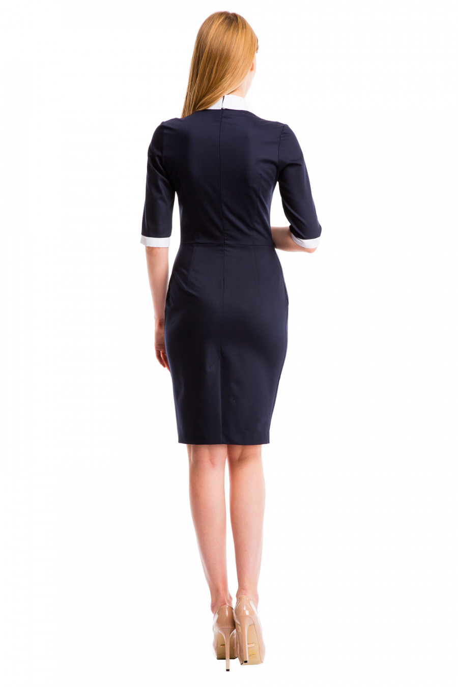 Стильное платье-футляр. Модель облегающего кроя из ткани костюмной группы. Рукав 3/4. Центральная часть оформлена в контрастном белом цвете с отложным воротником и планкой имитирующей застёжку на пуговицы. Манжеты окантованы в цвет центральной вставки. Длина-выше колена. Сзади-застёжка на пуговицы. Элегантная модель офисного типа.