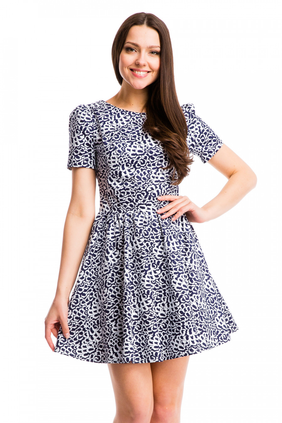 Оригинальное и стильное платье. Модель с короткими рукавами и округлым вырезом горловины. Юбка модели отрезная от линии талии, расклешенная со складками. Стильное решение для летних дней.