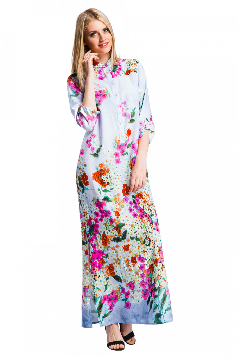 Стильное длинное платье. Модель свободного прямого кроя с разрезами по бокам. Платье с воротом на стойке и  укороченными рукавами с застёжкой  ""пата"" для фиксации подвёрнутого  рукава. По центральной части модель дополнена на пуговицы. Выполнена из легкого материала и украшено принтом.