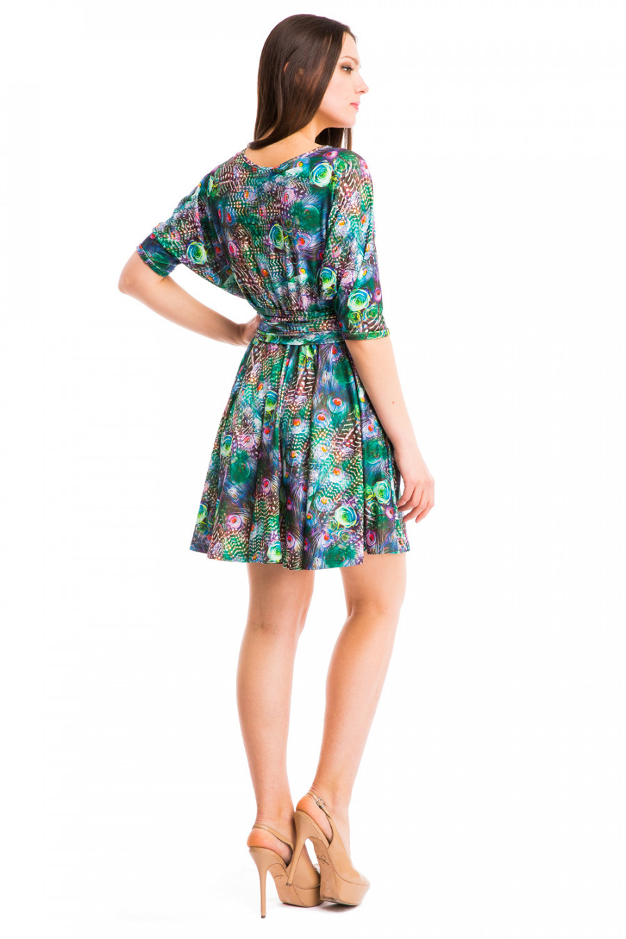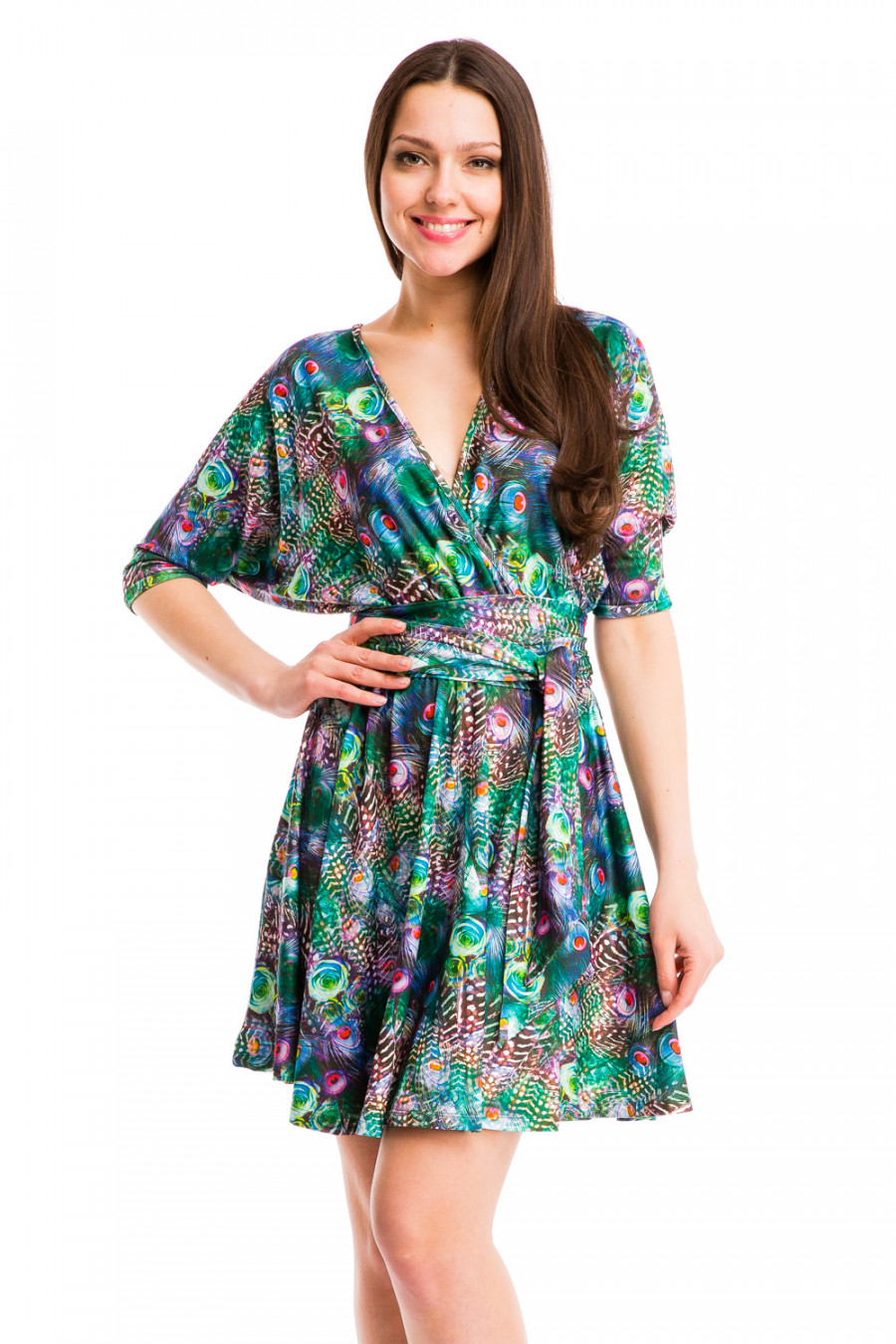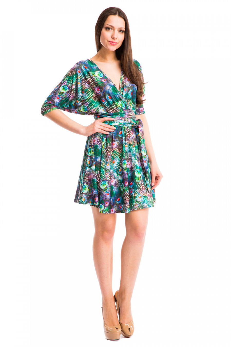 Стильное и женственное платье-мини с ярким принтом. Модель отрезного типа с глубоким вырезом декольте и рукавами 3/4 в виде ""летучей мыши"". Платье выполнено из приятной струящейся ткани высококачественного полотна микрофибры. На талии модель украшена изящным пояском и резинкой. Свободный верх и расклешенная юбка с поясом на талии подчеркивает стройность фигуры.