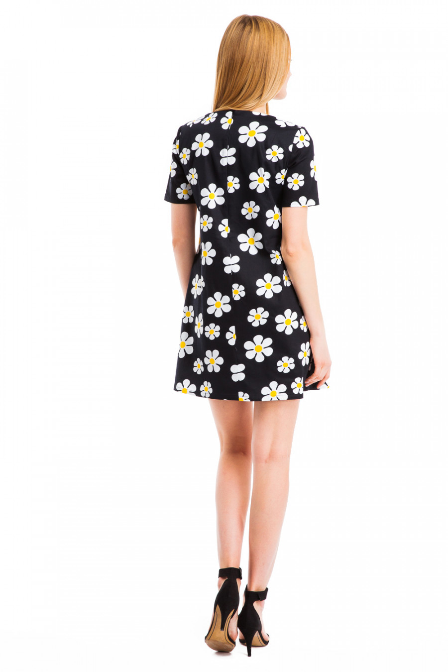 Платье с округлым вырезом горловины и короткими рукавами. Модель трапециевидного силуэта с боковыми карманами, выполнена из качественного материала текстильной группы и украшена ярким принтом в ромашки. Длина изделия выше колена. Лаконичный и изысканный дизайн модели непременно придётся Вам по вкусу. Великолепный выбор на любой случай.