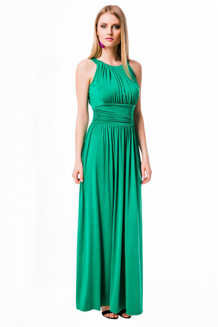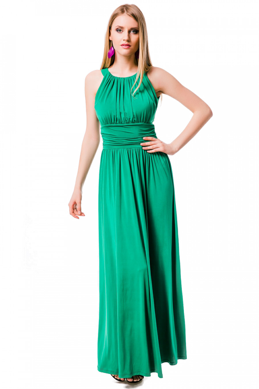 Длинное летнее платье, выполненное в оригинальном дизайне. Модель без рукавов приталенного покроя. Верхняя часть до линии талии драпирована мелкими складками, на талии широкая вставка-имитация пояса, также декорированная складками. Нижняя часть- юбка в пол. Модель выполнена из качественного струящегося материала. Изящная и нарядная модель для создания женственного образа.
