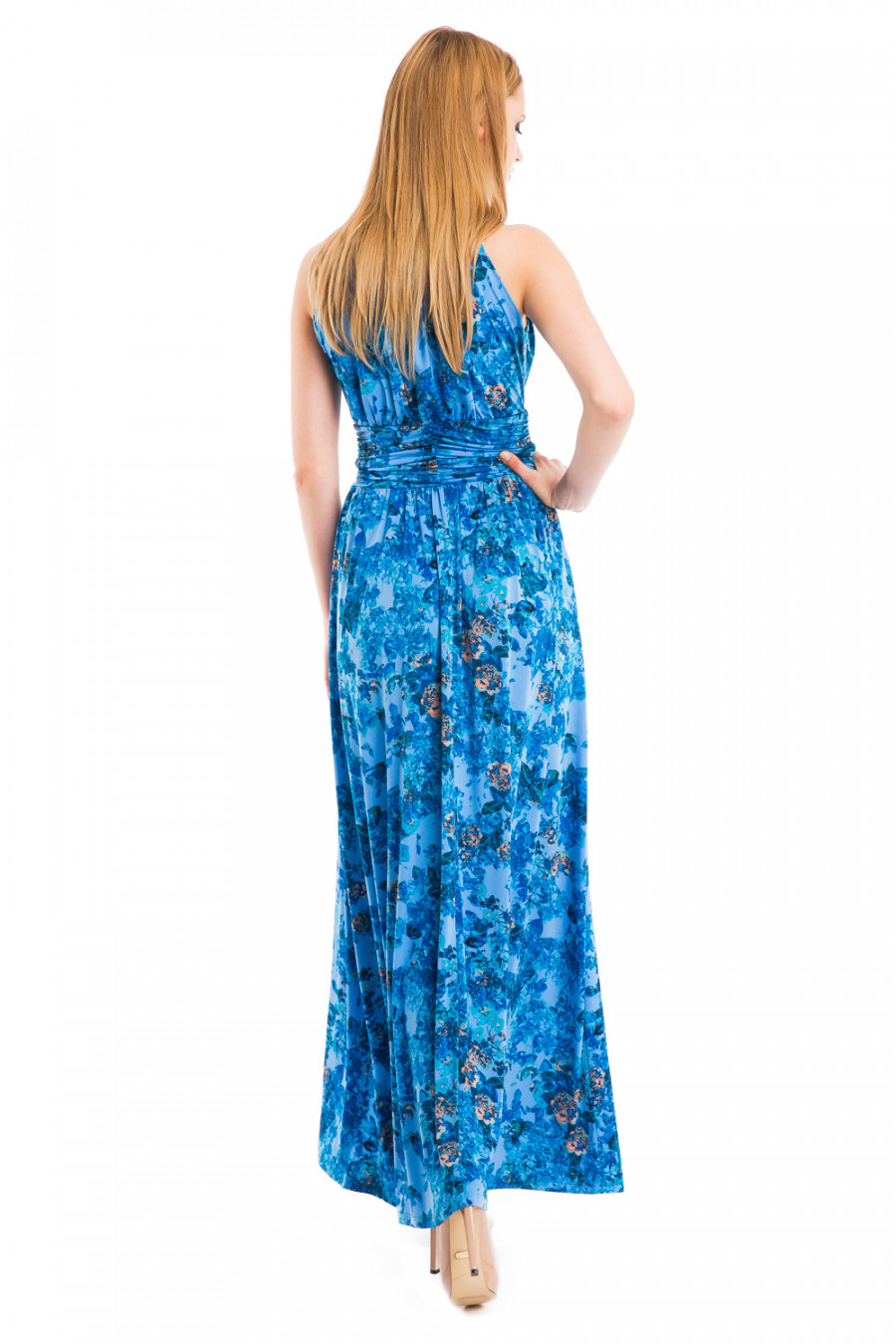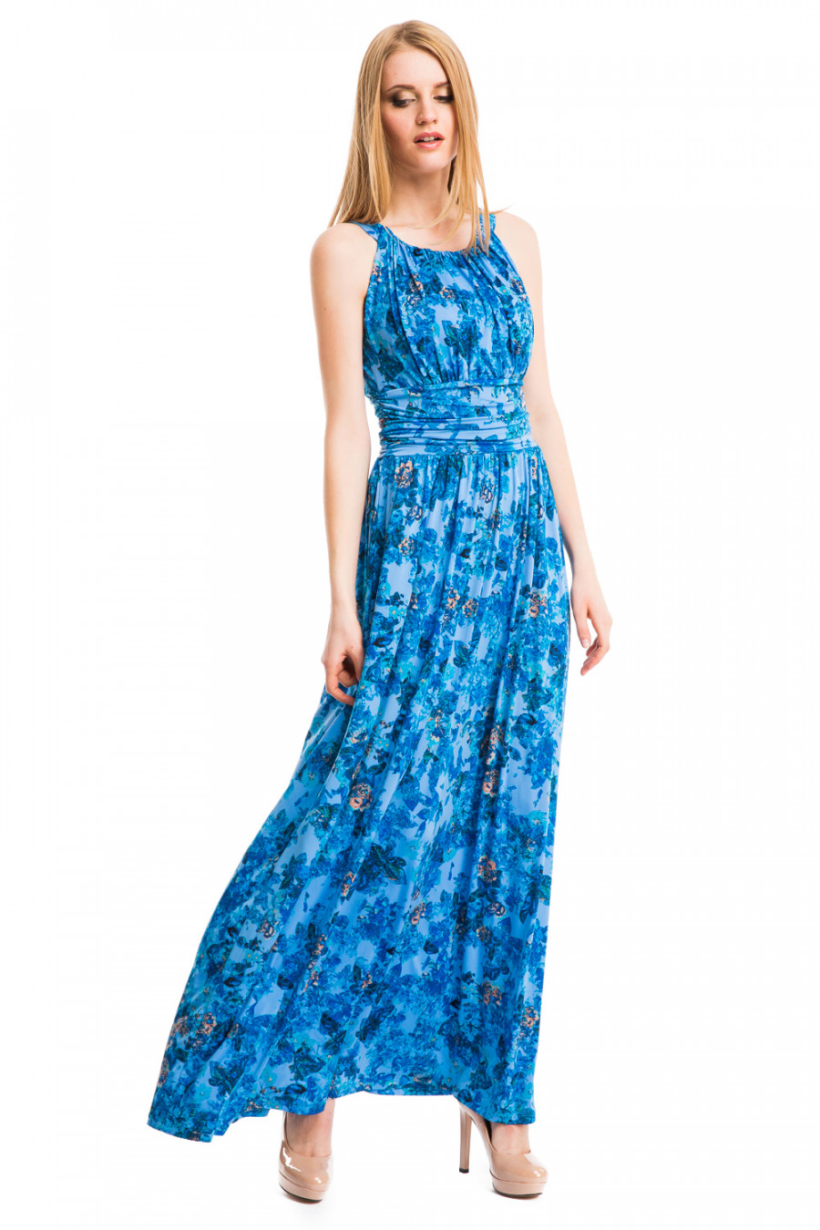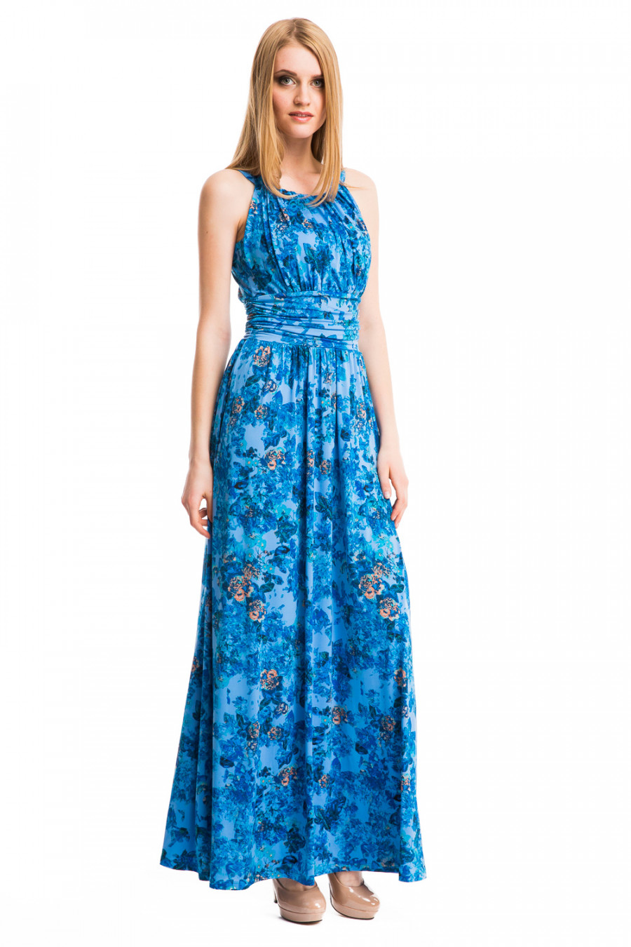 Длинное платье, выполненное в оригинальном дизайне. Модель без рукавов приталенного покроя. Верхняя часть до линии талии драпирована мелкими складками, на талии широкая вставка-имитация пояса, также декорированная складками. Нижняя часть- юбка в пол. Модель выполнена из качественного струящегося материала и украшена ярким принтом. Изящная и нарядная модель для создания женственного образа.
