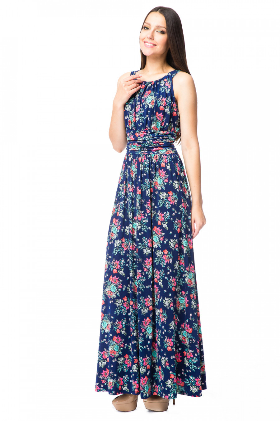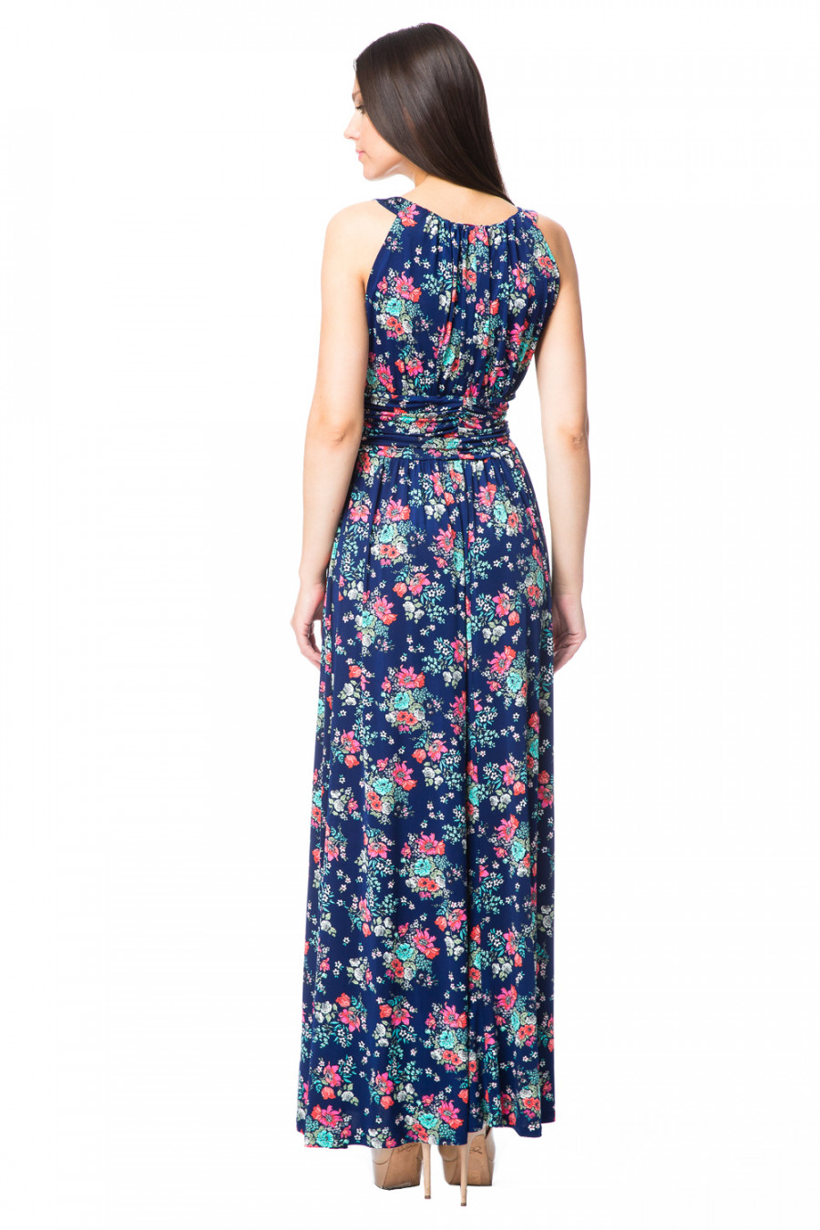 Длинное платье, выполненное в оригинальном дизайне. Модель без рукавов приталенного покроя. Верхняя часть до линии талии драпирована мелкими складками, на талии широкая вставка-имита