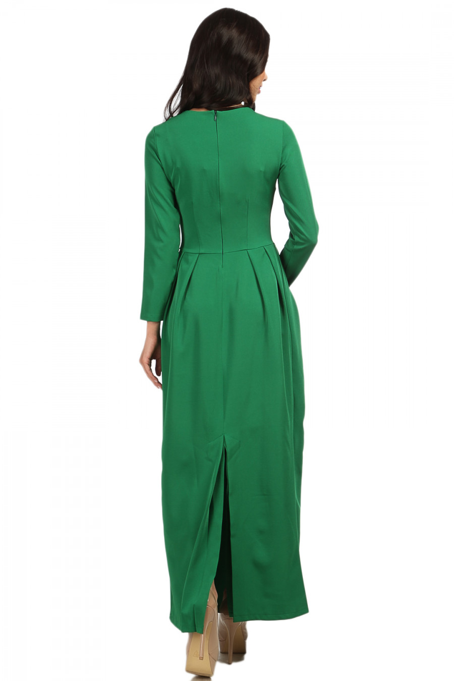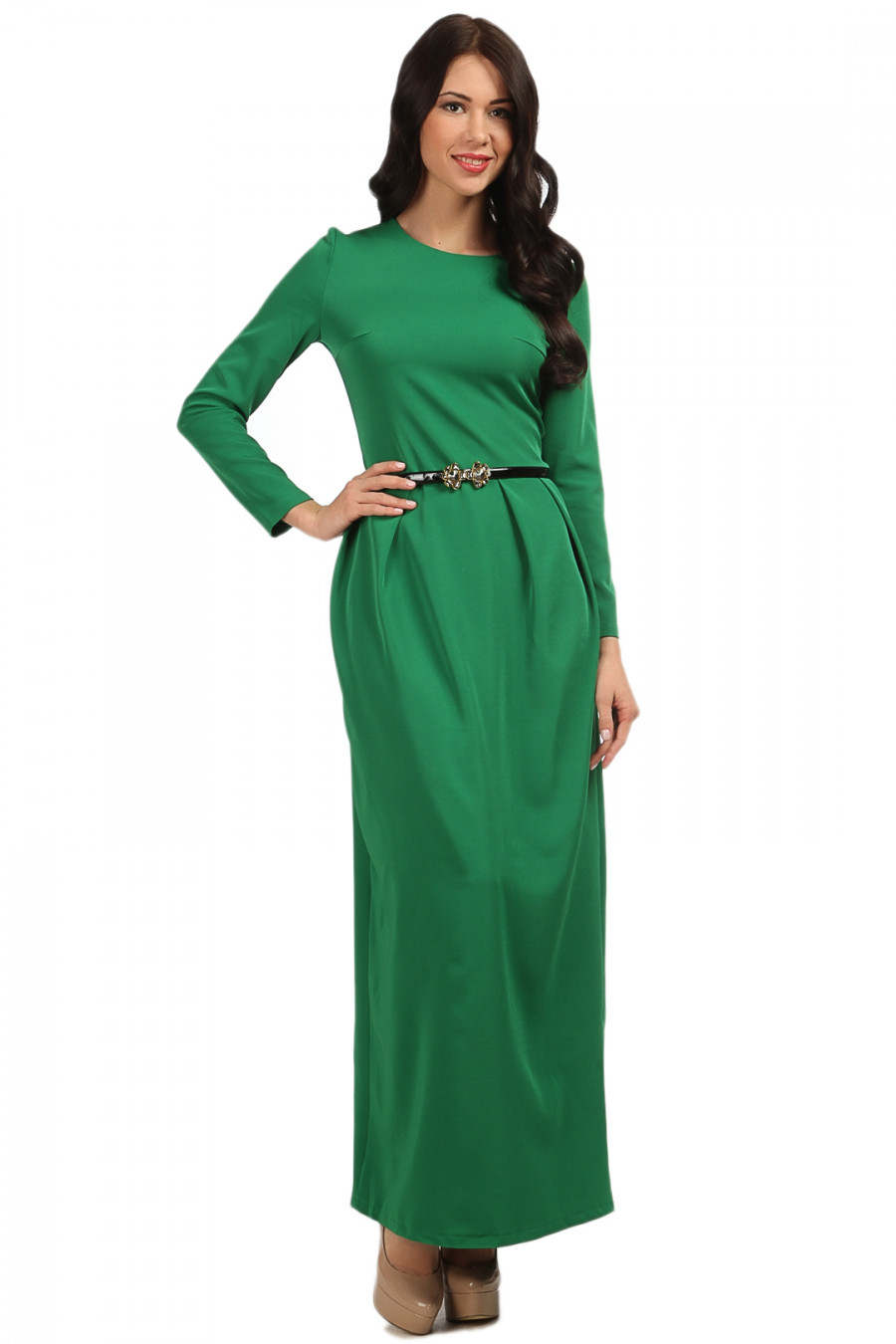 Элегантное длинное платье с вырезом "лодочка". Талию подчеркивает тонкий ремешок и вытачки.