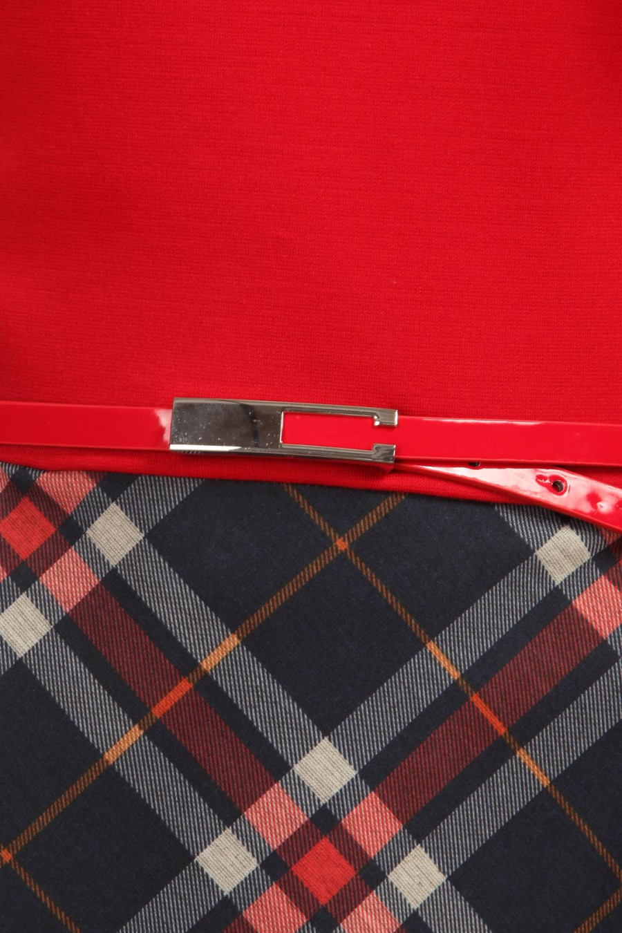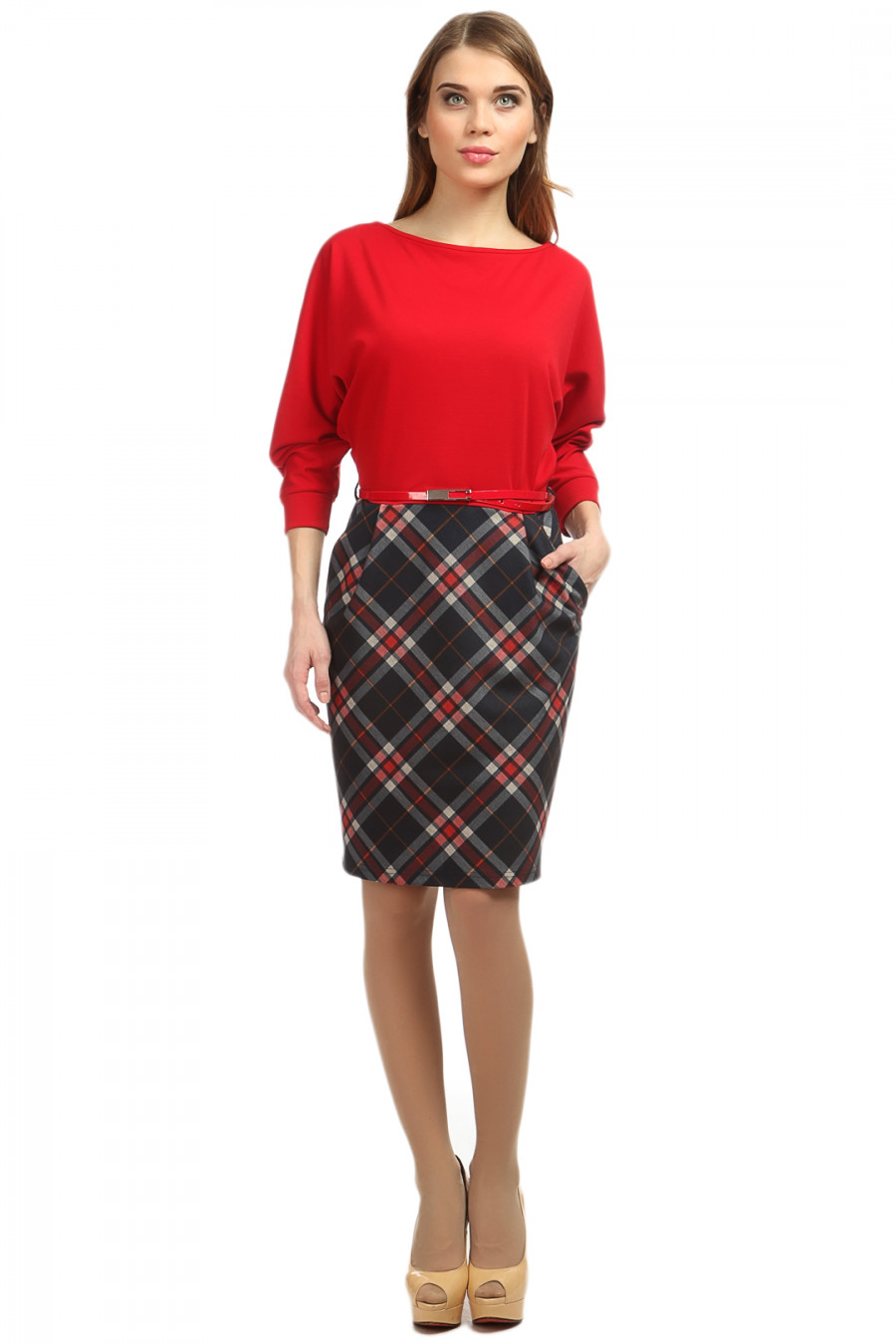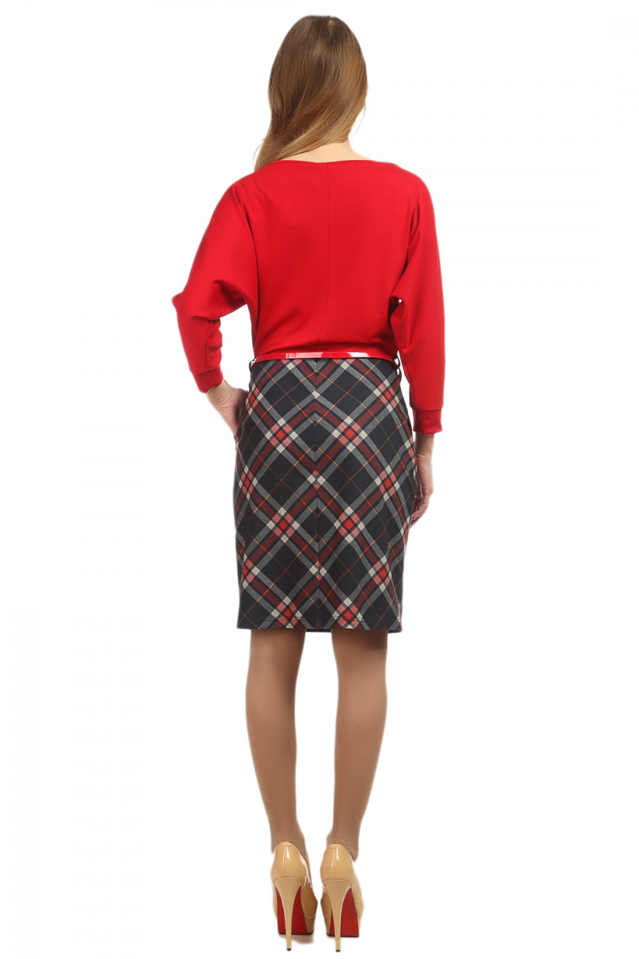 Платье создает впечатление костюма - кофты с большим круглым вырезом и облегающей клетчатой юбкой высокой посадки. Талию подчеркивает тонкий ремешок. Рукав 3/4.