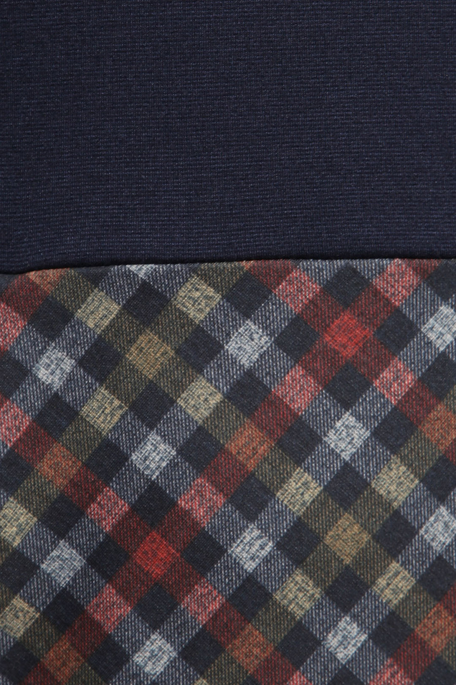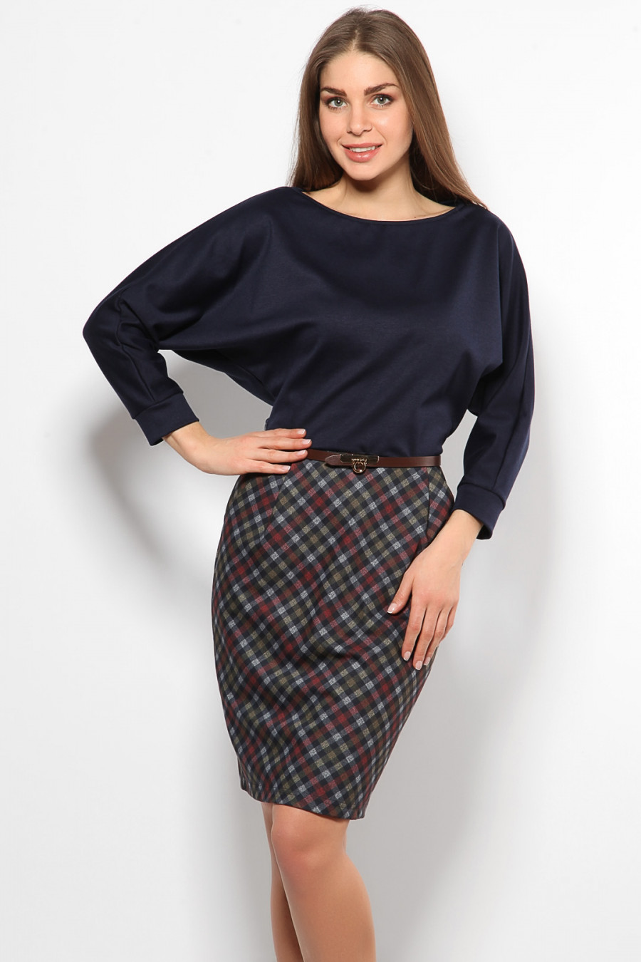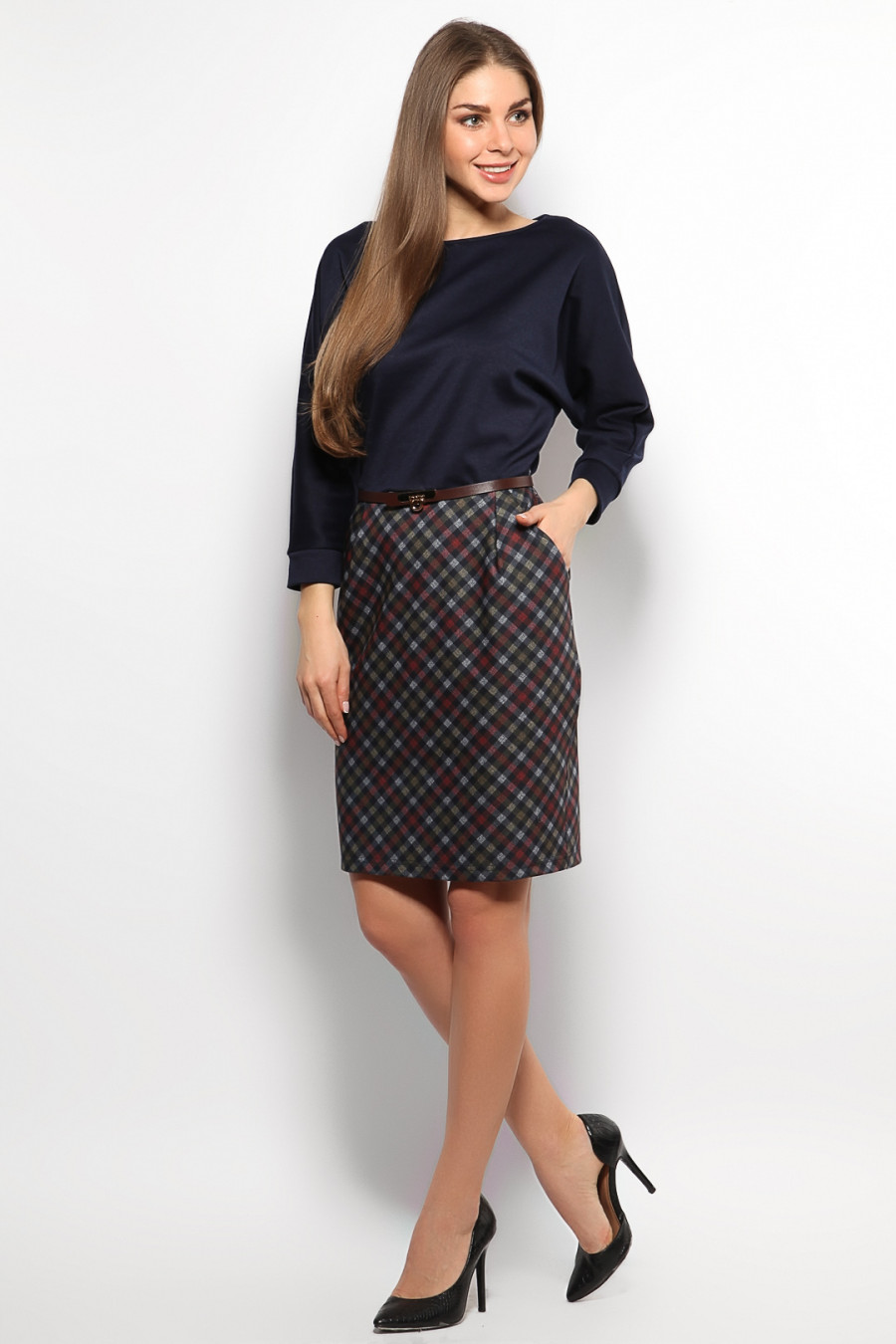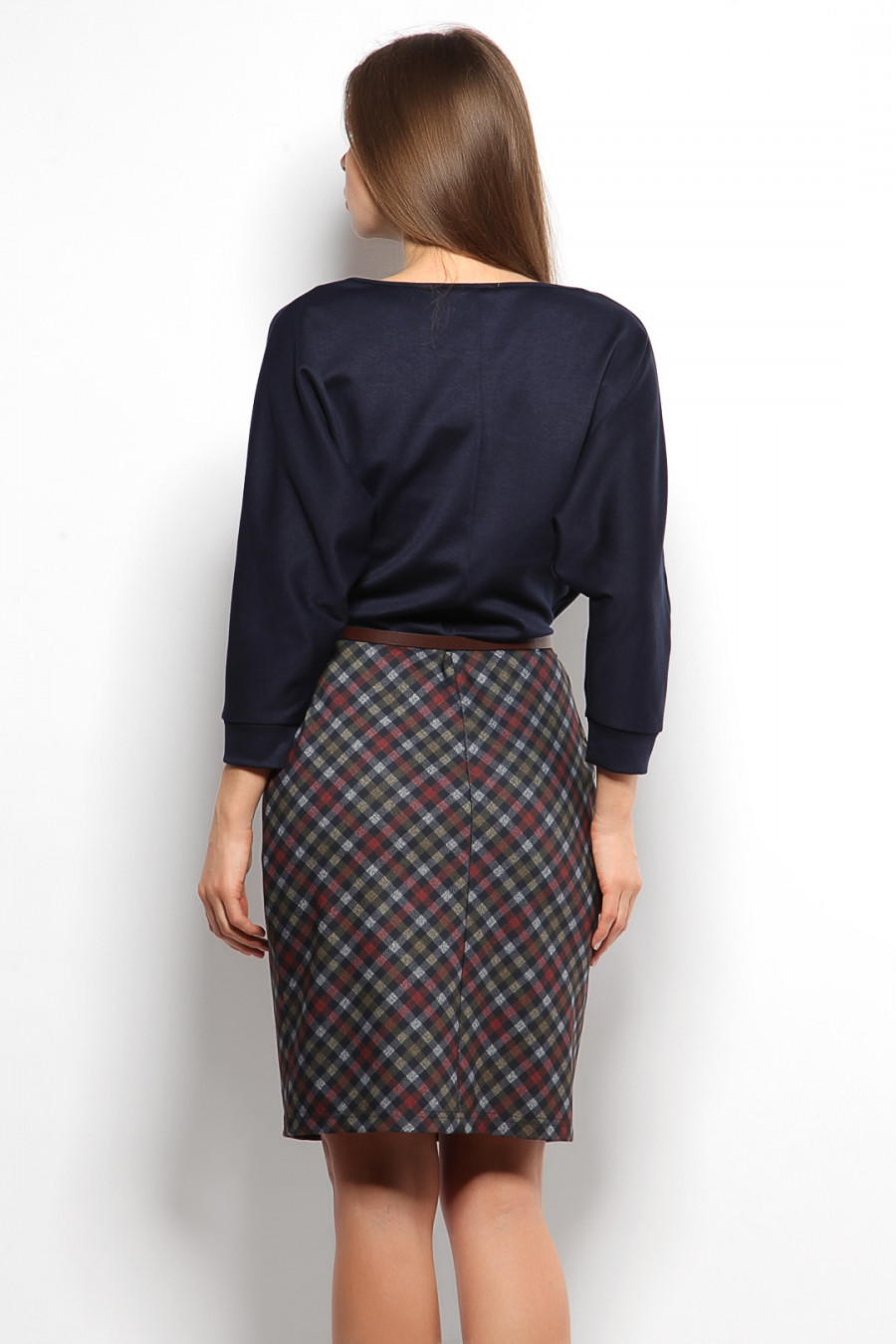 Платье создает впечатление костюма - кофты с большим круглым вырезом и облегающей клетчатой юбкой высокой посадки. Талию подчеркивает тонкий ремешок. Рукав 3/4.