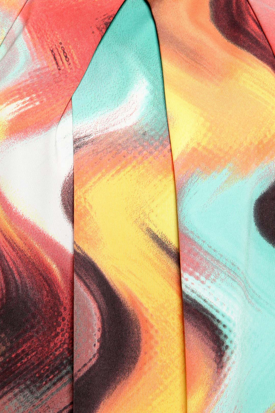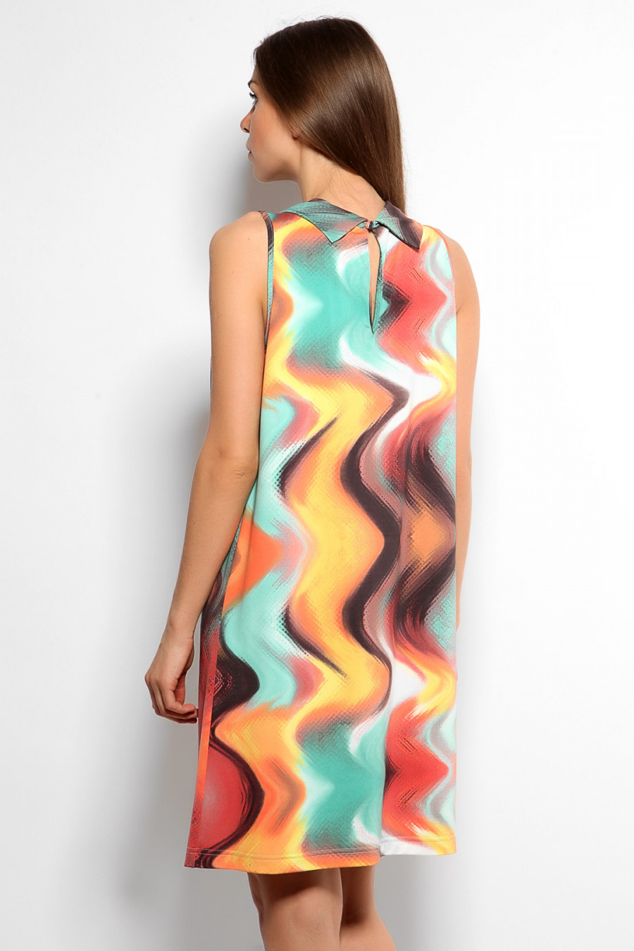 Короткое летнее платье, застегивающееся на пуговку сзади на шее. Фасон дополняет интересный принт в виде разноцветных волн.