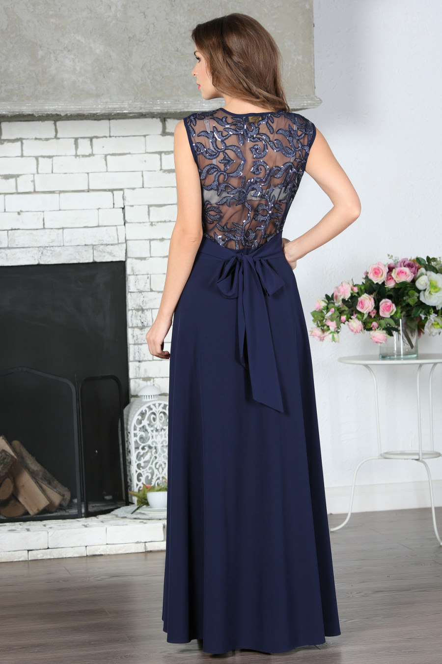 Комбинированное платье для торжественного или вечернего случая. Выполнено платье из двух, разных по структуре тканей: лиф из роскошной сетки с узором пайетками и продублирован тканью в тон платья, расклешенная юбка из легкой шелковистой ткани текстильной группы в тон верха. Дополнение съемный пояс-бант.