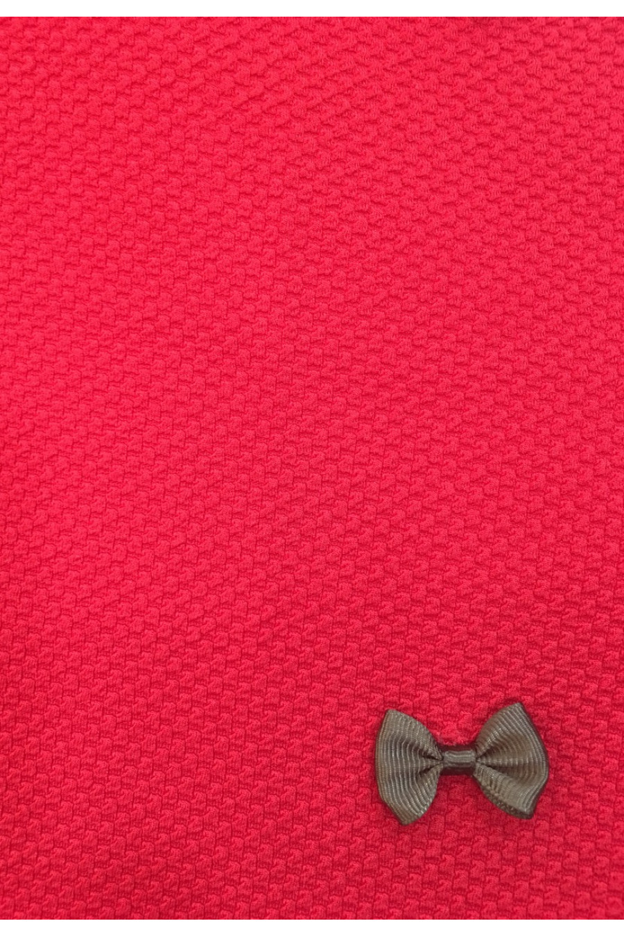 Нарядное платье из плотной ткани текстильной группы с добавлением эластина . Отрезное по талии , округлым вырезом горловины и рукавами 3\4 . Расклешенная юбка спереди украшена кокетливыми бантиками контрастного цвета .Платье без подкладки так как ткань плотная , хорошо держит форму и не просвечивает . Без застежки .