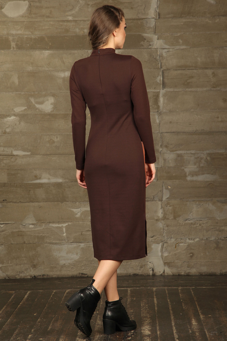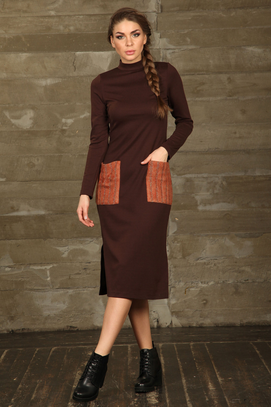 Оригинальное платье-миди прилегающего силуэта . Основная часть платья выполнена из трикотажа средней плотности, который хорошо держит форму. Застежка со спины на потайную молнию . Накладные карманы и дополнительный съемный ворот -хомут выполнены из мягкого трикотажа с выпуклой фактурой .В дополнение к платью идет оригинальная металлическая подвеска на шелковом шнурке.