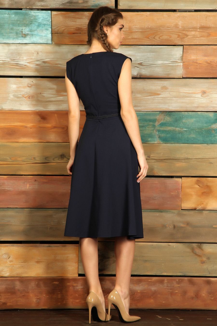Приталенное платье без рукавов с V-образной горловиной. Застегивается потайной молнией на спине.