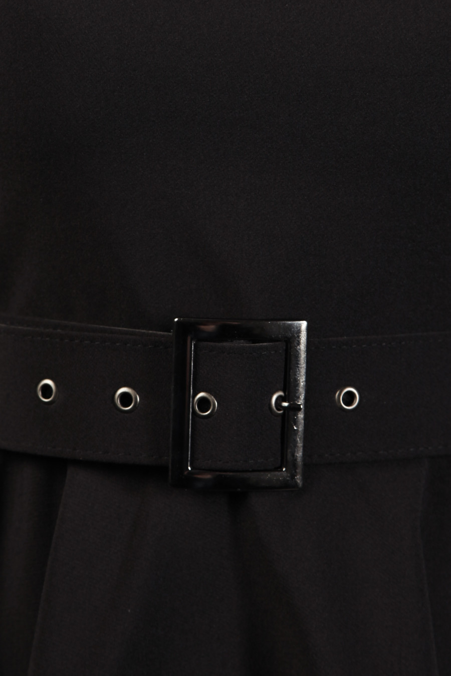 Платье приталенное, асимметричного кроя, без рукавов. Оформлено широким поясом.