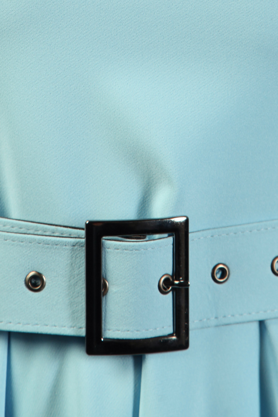 Платье приталенное, асимметричного кроя, без рукавов. Оформлено широким поясом.