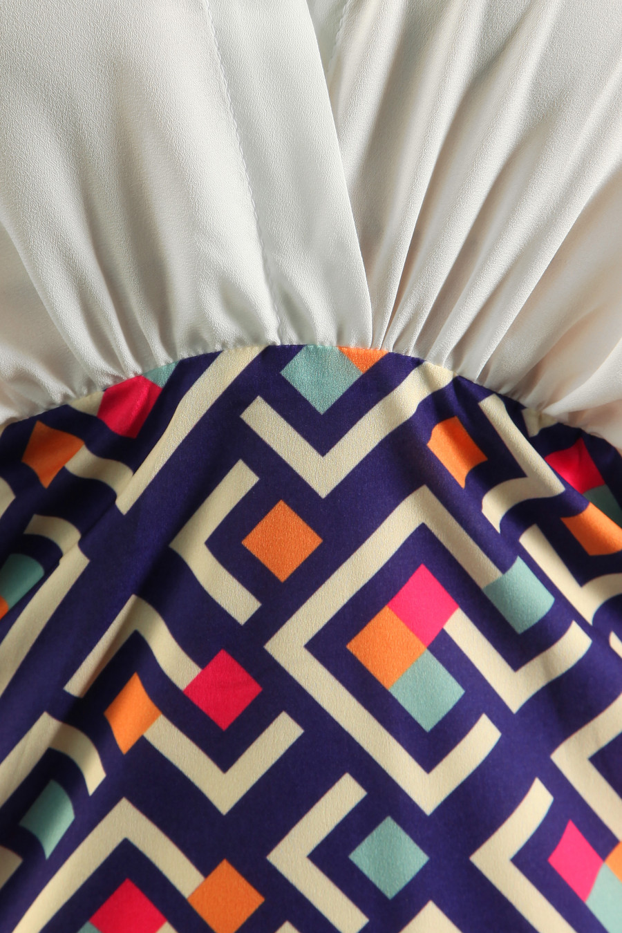 Оригинальное платье с глубоким декольте, присборенным рукавом 3/4, свободным верхом и юбкой в обтяжку.