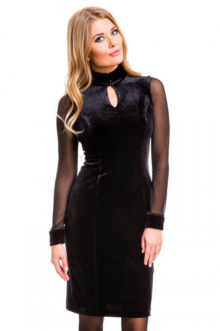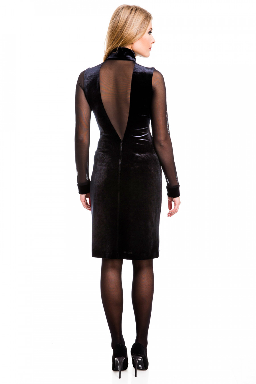 Невероятно женственное платье из бархата приталенного силуэта с длиной чуть выше колена. Модель декорирована полупрозрачными вставками в тон основного цвета платья на рукавах, на спине в виде глубокого выреза. Оригинальный ворот-стойка с застежкой на пуговицы, и манжеты также выполнены из бархата. На груди небольшой вырез в форме капли. Великолепная модель для шикарного вечера.