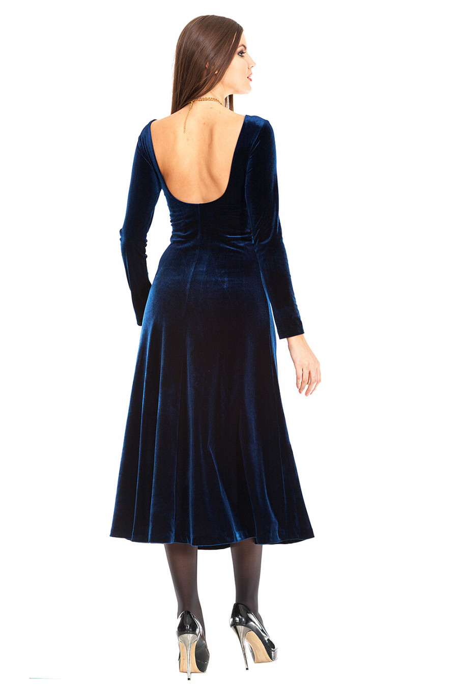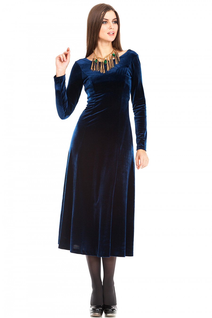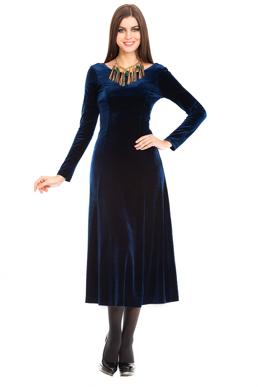 Очаровательное платье из бархата с длинным рукавом. Модель приталенного силуэта с округлым вырезом горловины. Нижняя часть выполнена в виде свободной юбки, которая, благодаря бархату,