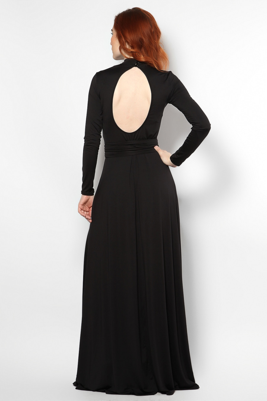 Вечернее длинное платье из тонкой струящейся ткани изящно подчеркнет достоинства фигуры. Длинный рукав, высокий ворот и длина в пол создают образ сдержанной и строгой леди. Пикантность платью придает округлый вырез открывающий спину. Широкий пояс, подчеркивающий талию, может быть завязан в нескольких вариантах.