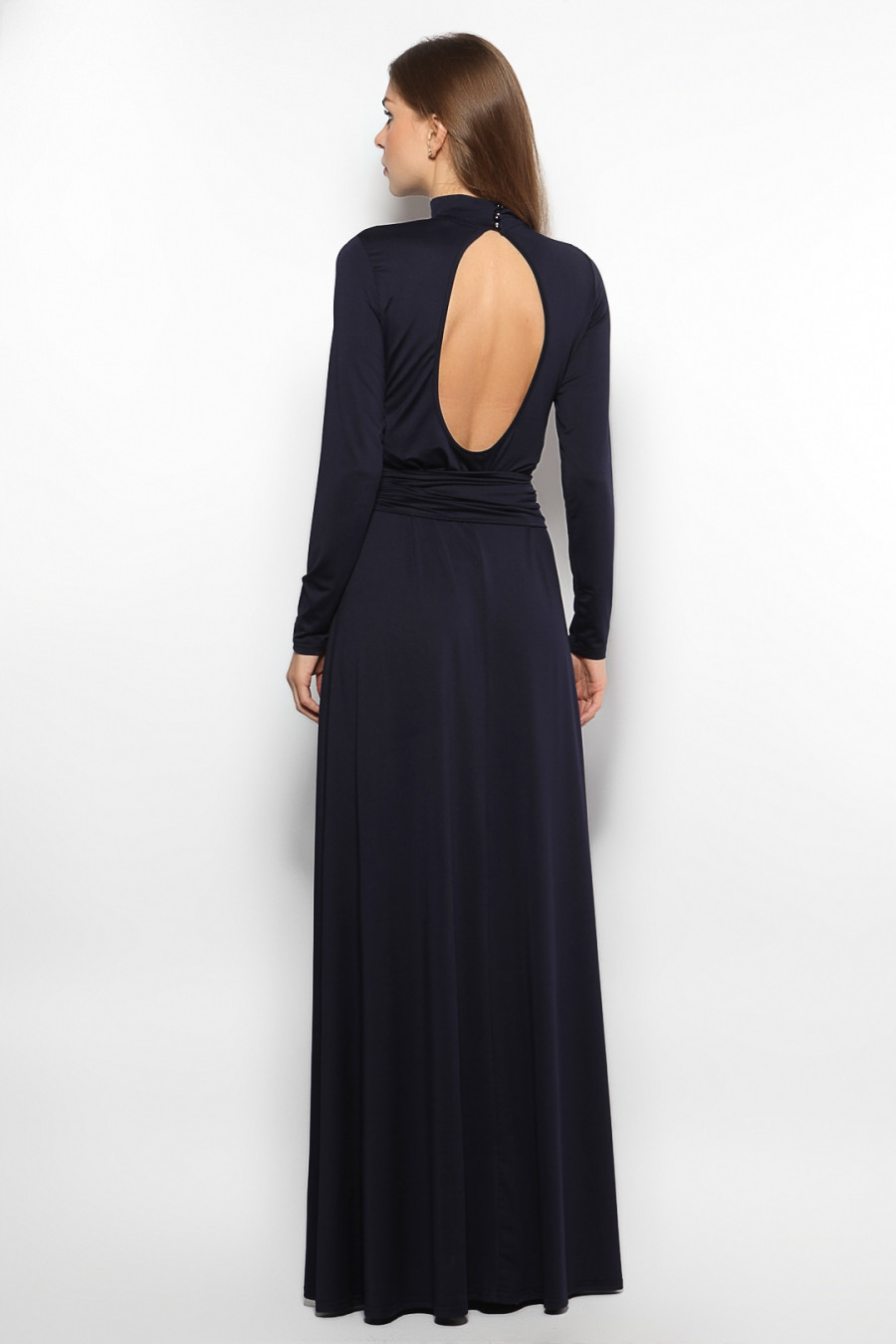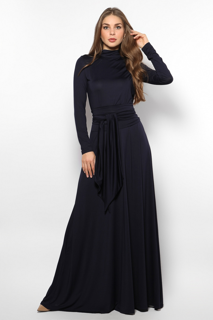 Вечернее длинное платье из тонкой струящейся ткани изящно подчеркнет достоинства фигуры. Длинный рукав, высокий ворот и длина в пол создают образ сдержанной и строгой леди. Пикантность платью придает округлый вырез открывающий спину. Широкий пояс, подчеркивающий талию, может быть завязан в нескольких вариантах.