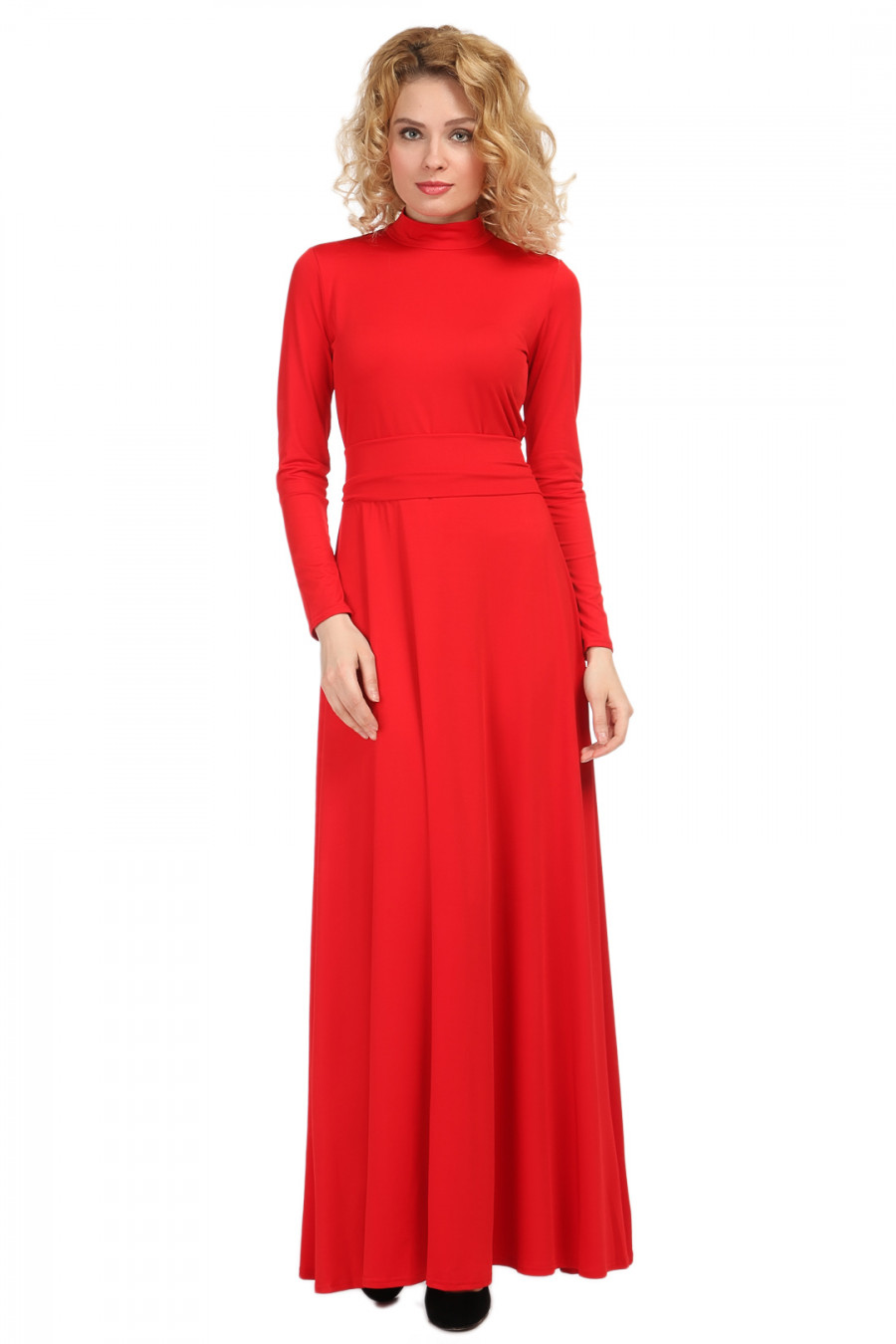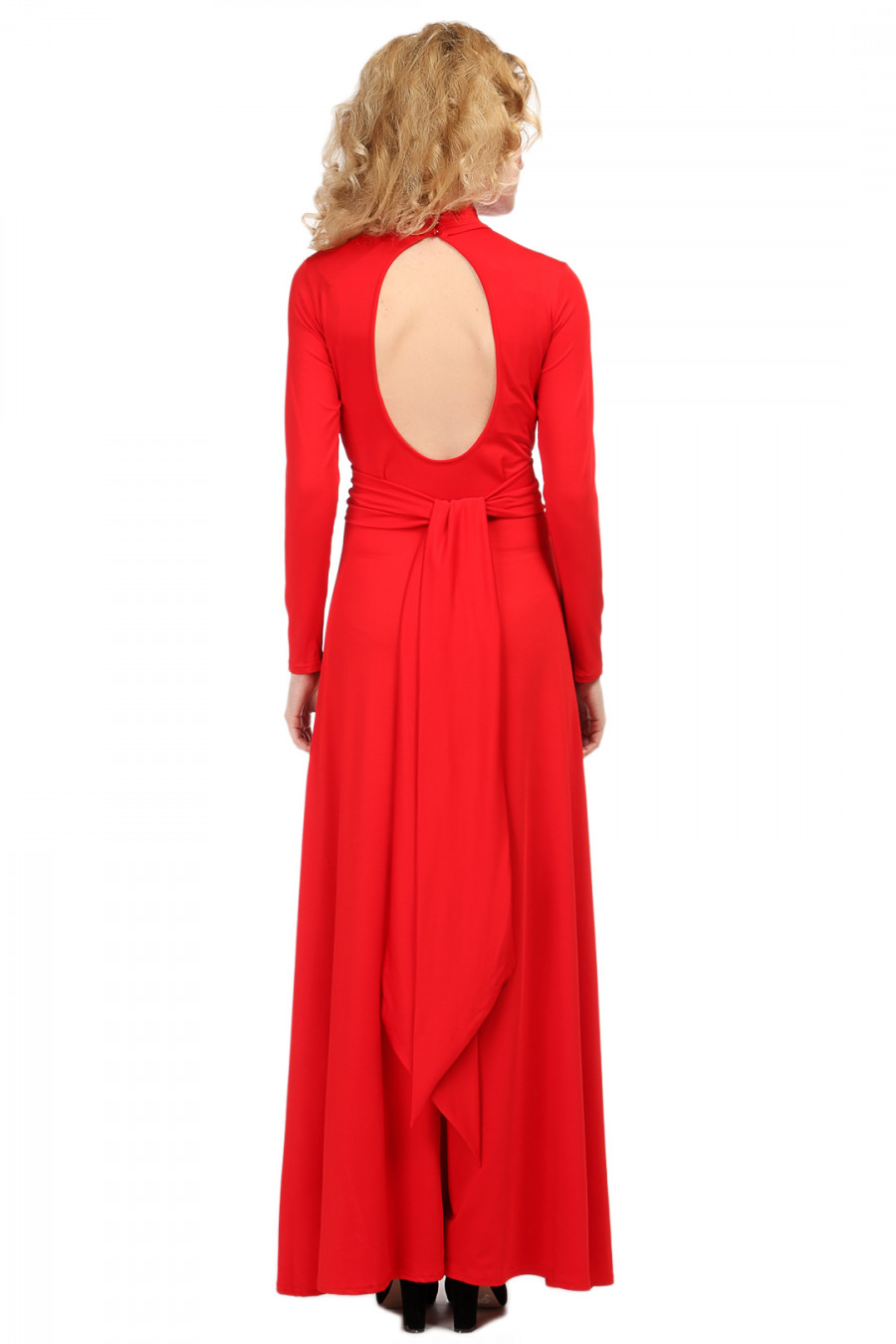 Вечернее длинное платье из тонкой струящейся ткани изящно подчеркнет достоинства фигуры. Длинный рукав, высокий ворот и длина в пол создают образ сдержанной и строгой леди. Пикантность платью придает округлый вырез открывающий спину. Широкий пояс, подчеркивающий талию, может быть завязан в нескольких вариантах.