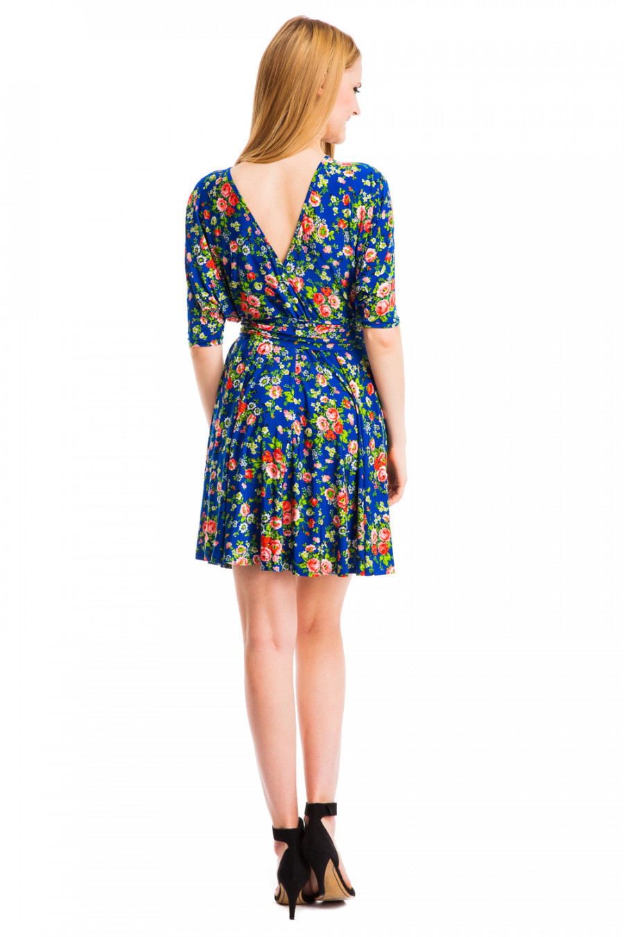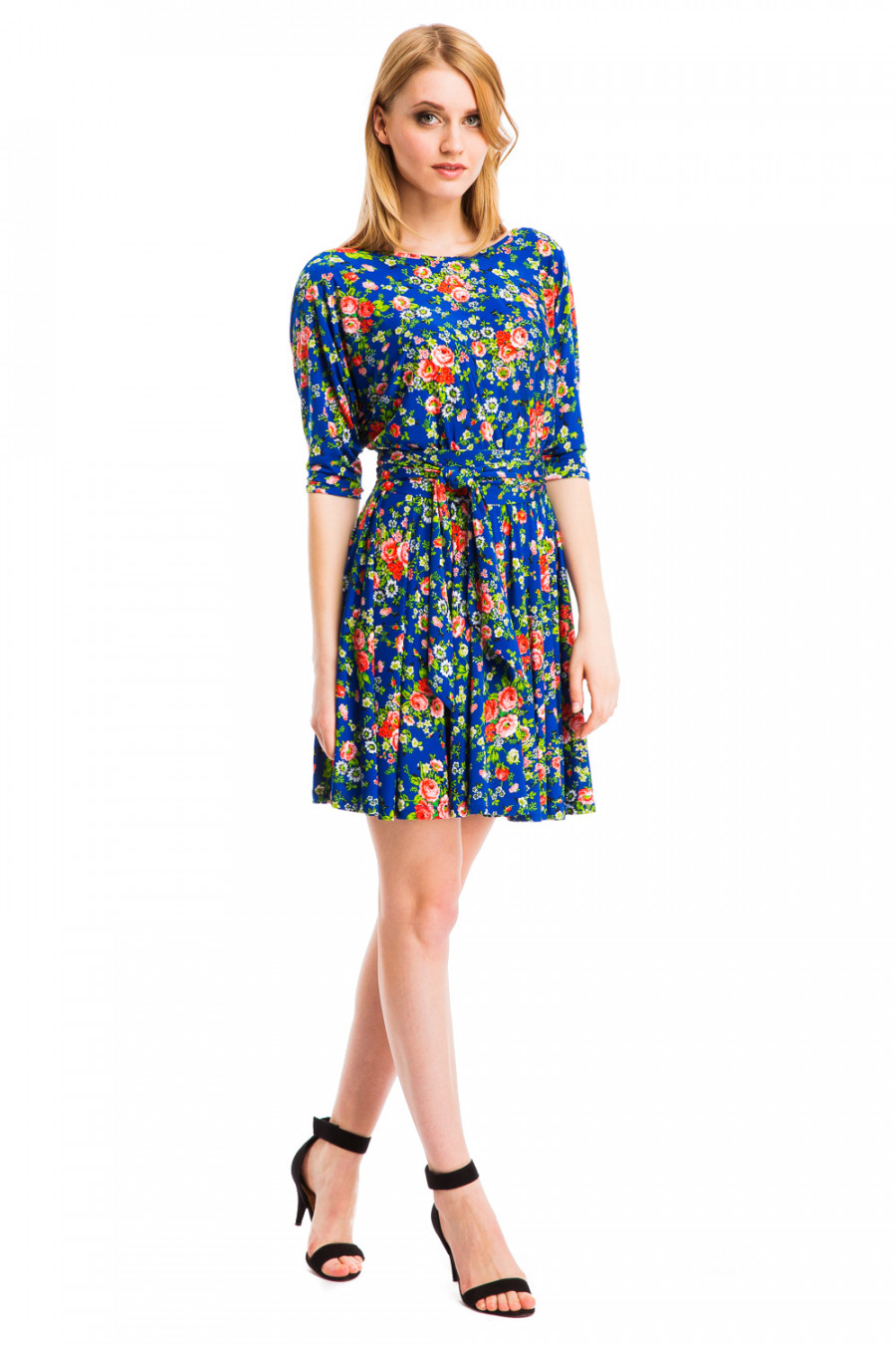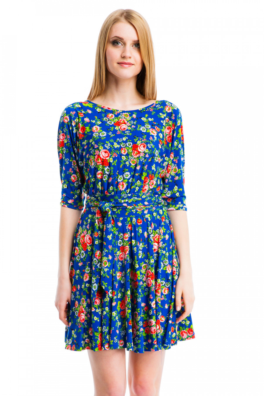 Стильное и женственое платье-мини с ярким принтом. Модель отрезного типа с глубоким вырезом декольте и рукавами 3/4 в виде ""летучей мыши"". Платье выполнено из приятной струящейся ткани высококачественного полотна микрофибры. На талии модель украшена изящным пояском и резинкой. Свободный верх и расклешенная юбка с поясом на талии подчеркивает стройность фигуры.