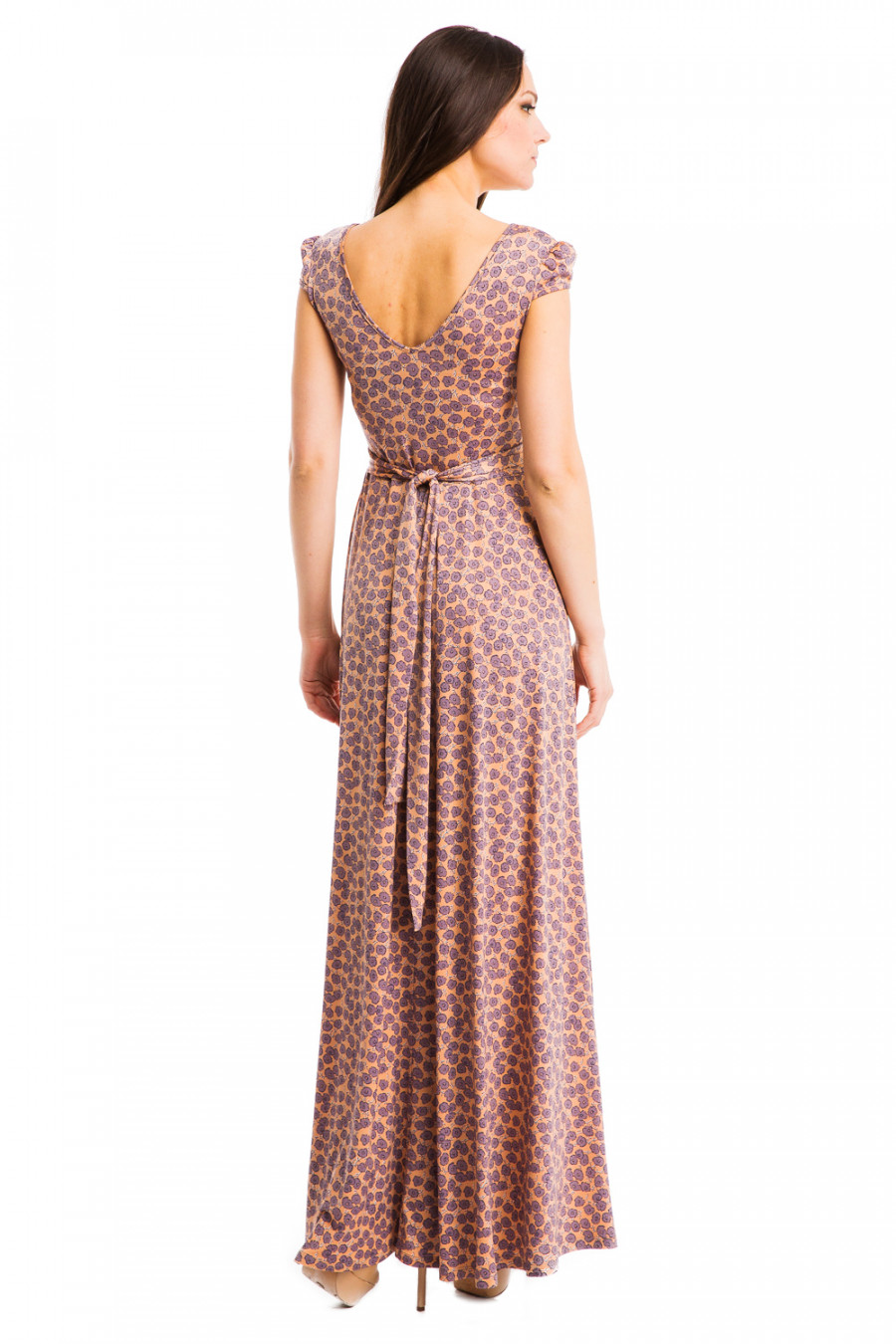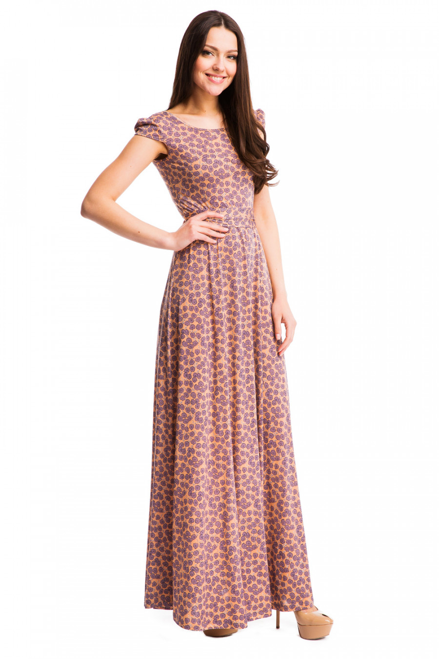 Изящное платье в пол с коротким рукавом. Модель с округлым вырезом горловины и глубоким вырезом в виде треугольника на спине. Длинное платье выполнено из приятной струящейся ткани высококачественного полотна микрофибры и украшено принтом в нежных тонах. На талии модель украшена изящным пояском. Изысканный наряд создаст обворожительный неповторимый образ.