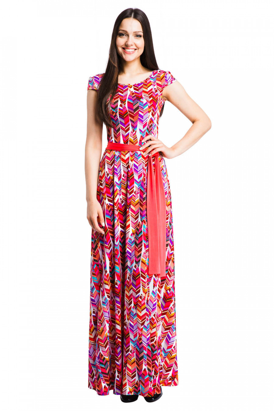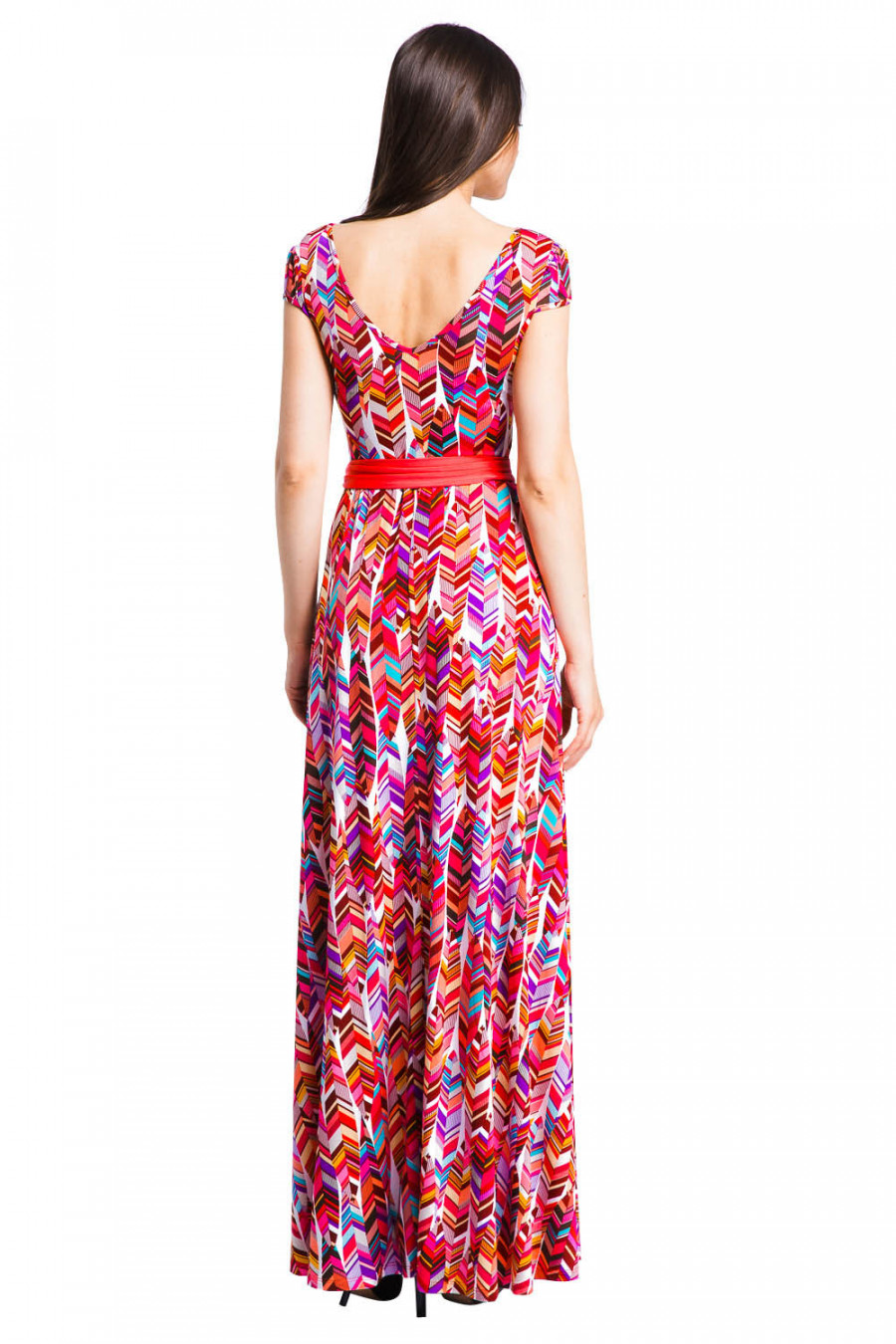 Изящное платье в пол с коротким рукавом. Модель с округлым вырезом горловины и глубоким вырезом в виде треугольника на спине. Длинное платье выполнено из приятной струящейся ткани высококачественного полотна микрофибры и украшено ярким принтом. На талии модель украшена изящным пояском. Изысканный наряд создаст обворожительный неповторимый образ.