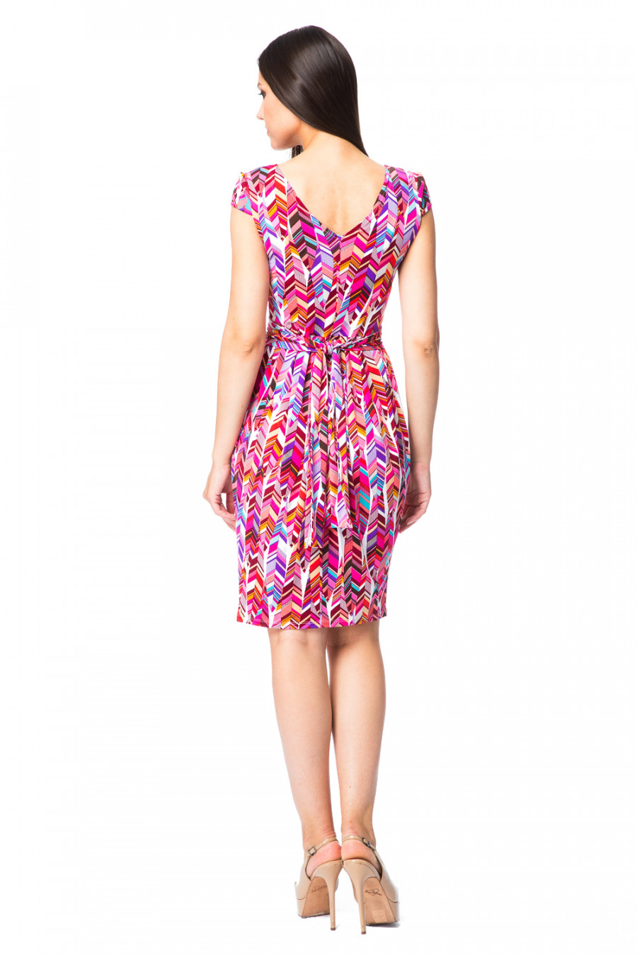 Изящное платье из микрофибы.Модель оформлена очаровательным абстрактным рисунком. Изделие с округлым вырезом горловины и короткими рукавами, на талии украшено аккуратным поясом. При