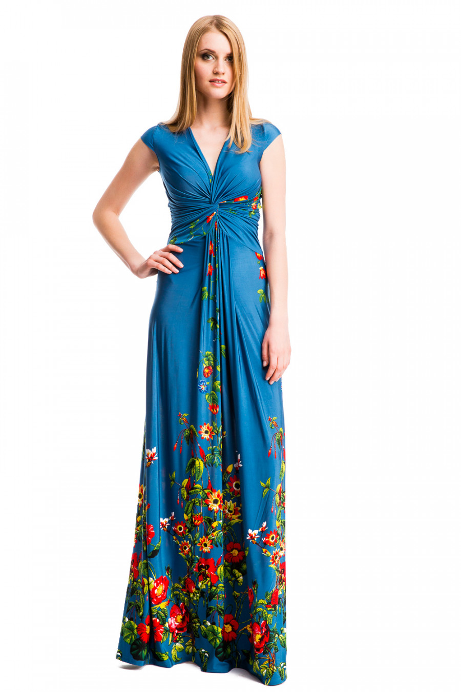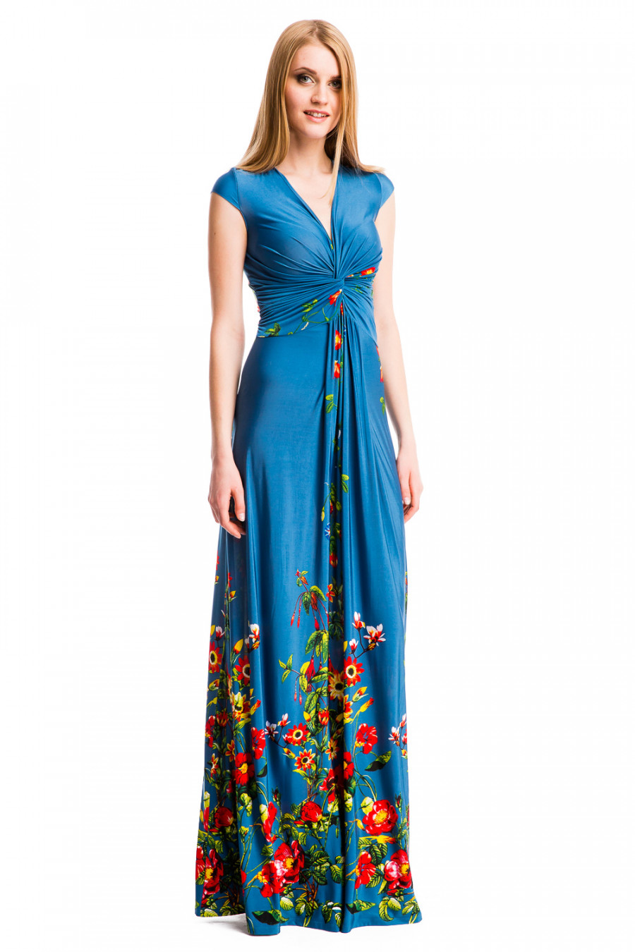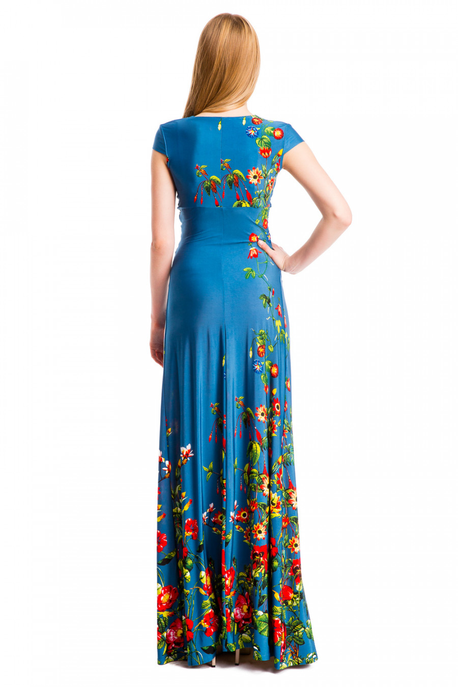Длинное летнее платье, выполненное в оригинальном дизайне. Модель с короткими рукавами приталенного покроя. Верхняя часть до линии талии драпирована мелкими складками, на талии также декорирование складками. Нижняя часть- юбка в пол. Модель выполнена из качественного струящегося материала и украшено принтом в цветочек. Изящная и нарядная модель для создания женственного образа.