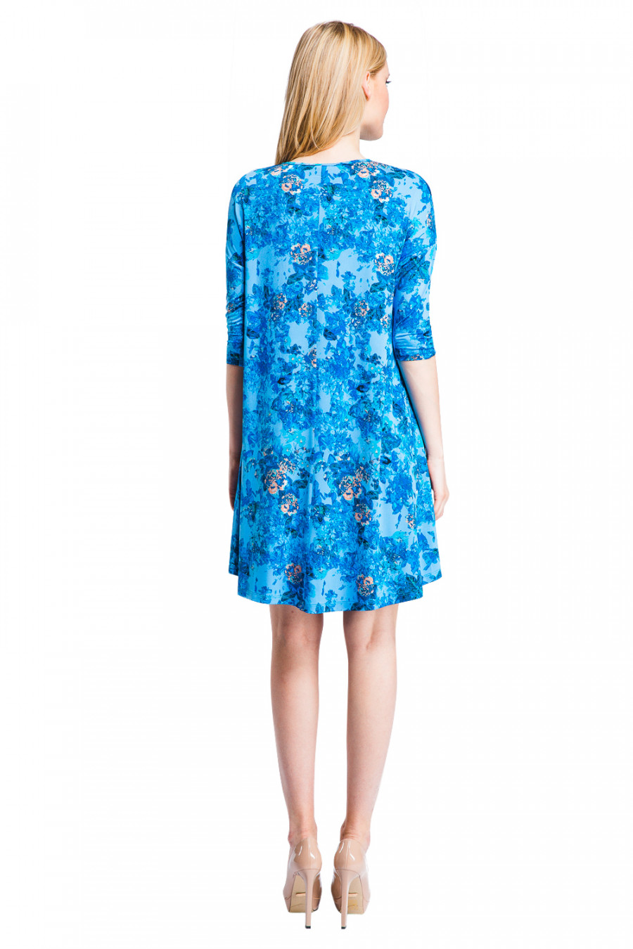 Изящное платье свободного кроя. Модель с округлым вырезом горловины и рукавами 3/4. Трапециевидный свободный крой делает модель лёгкой и воздушной. Передняя часть модели укорочена. Платье выполнено из качественного материала-микрофибры. Модель выполнена в бирюзовом цвете с принтом.