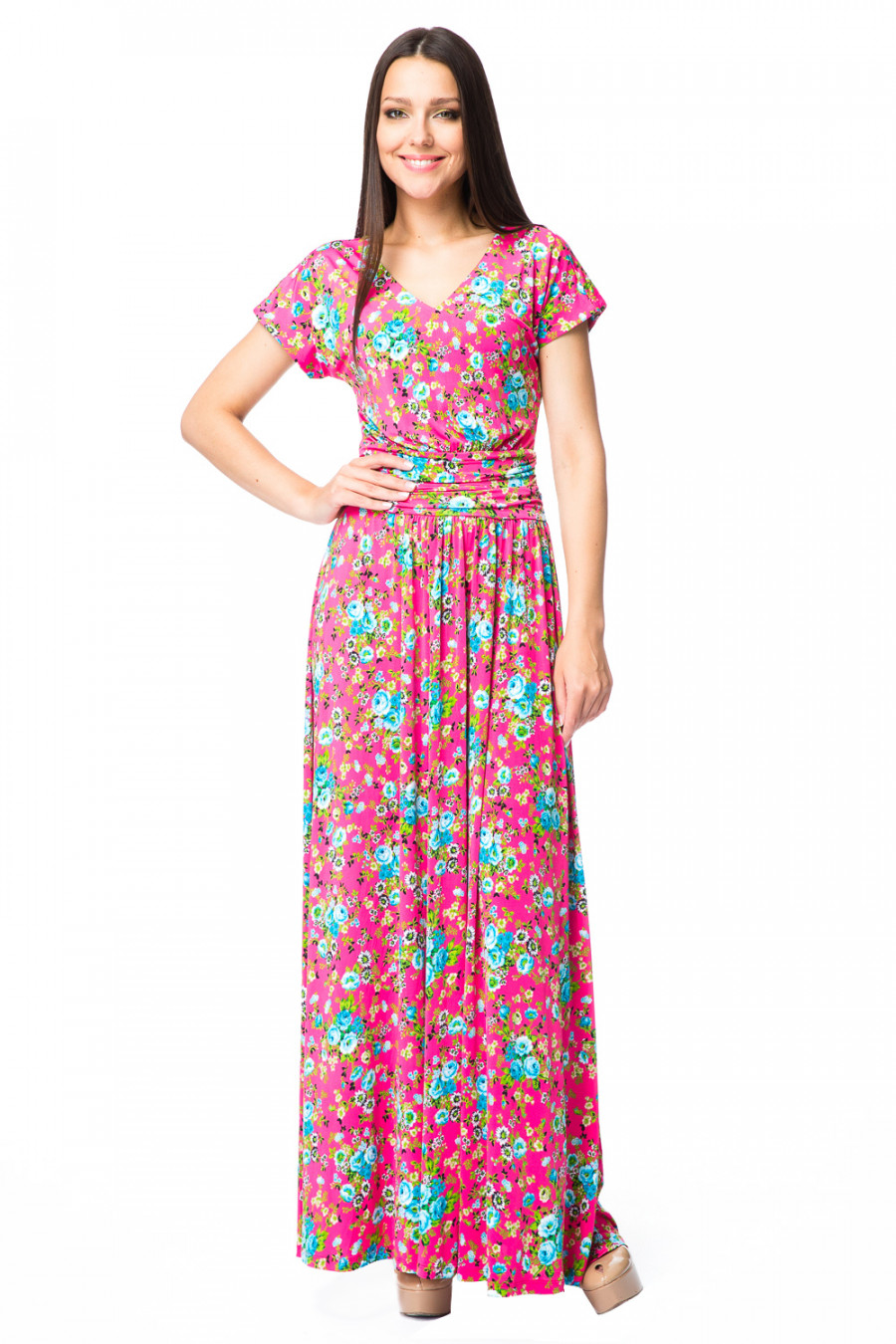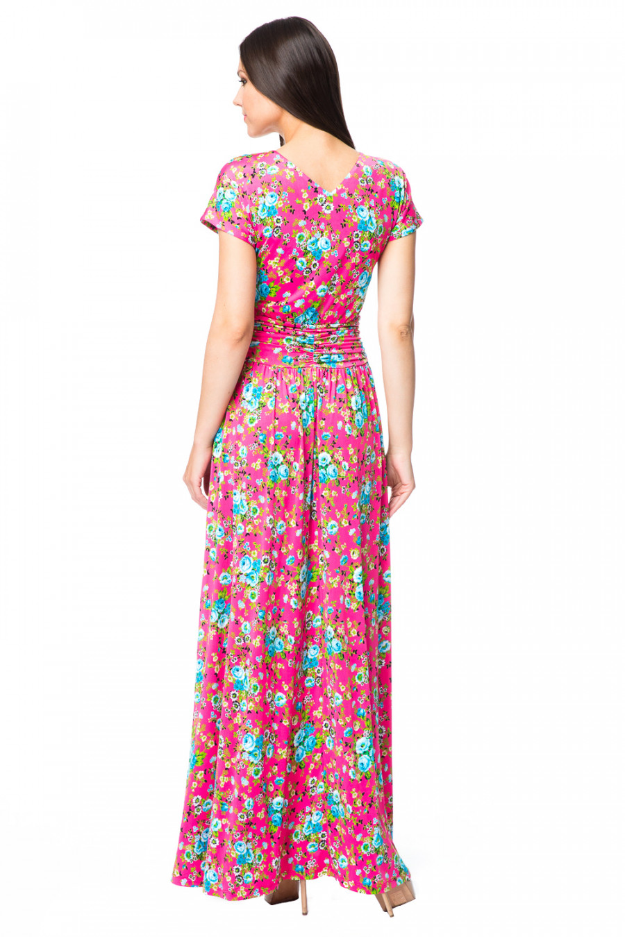 Длинное платье, выполненное в оригинальном дизайне. Модель приталенного покроя с V-образным вырезом горловины и коротким рукавом. На талии широкая вставка-имитация пояса, декорированна