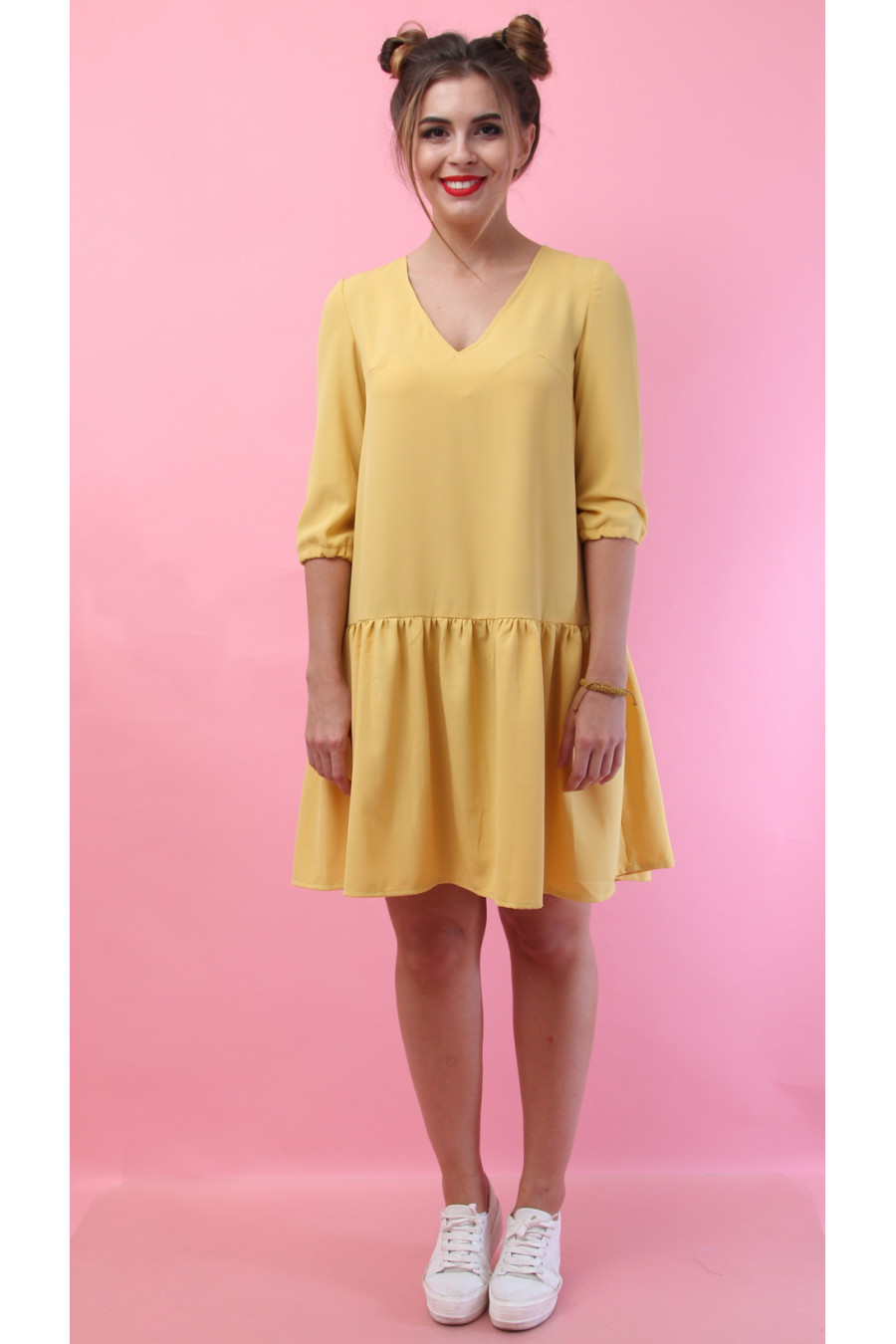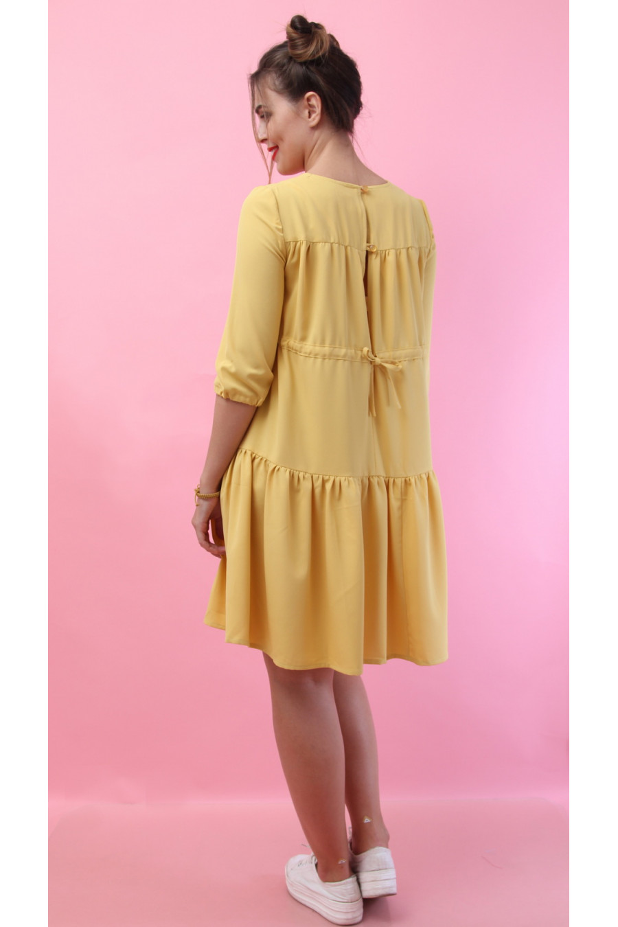 Свободное платье с воланом по низу, сзади интересная застежка на пуговки, шнуровка на спинке, рукав 3\4.