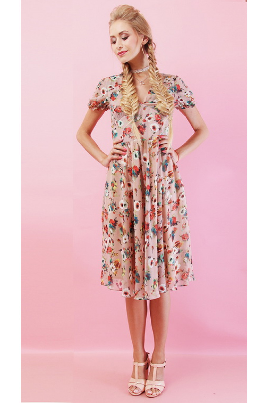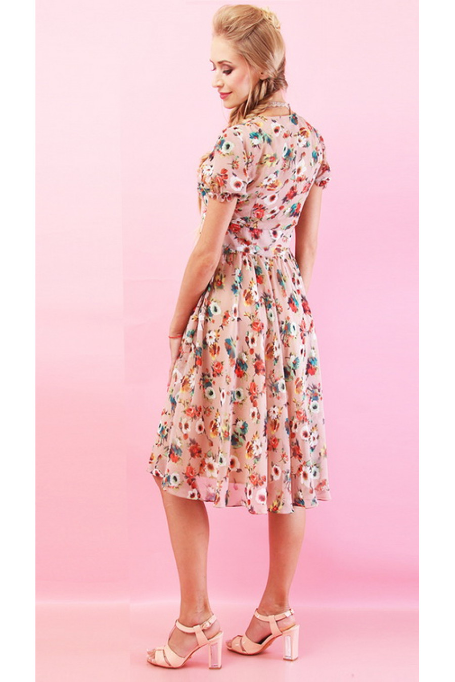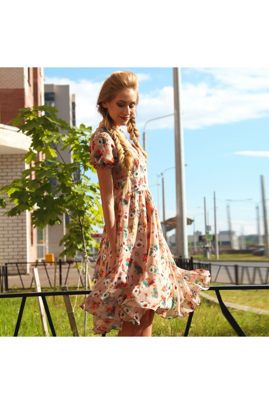 Легкое шифоновое платье с цветочным принтом, V - образный вырез, короткий рукав на резинке, широкий втачной пояс, расклешенная юбка на подкладке.
