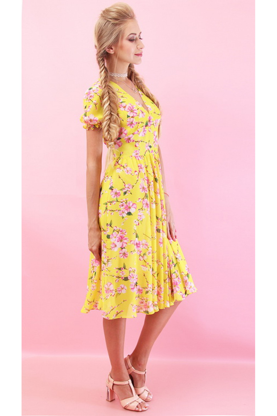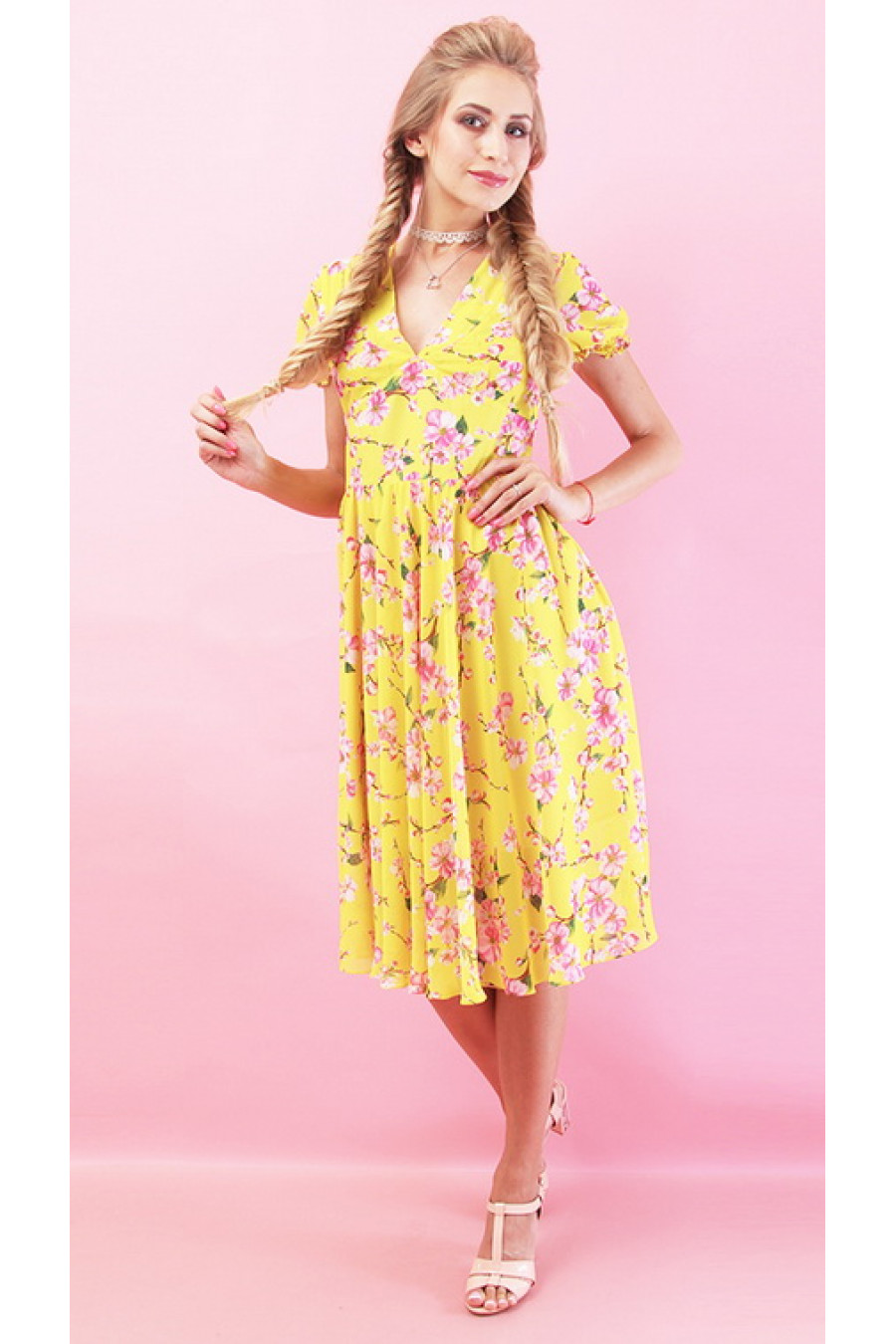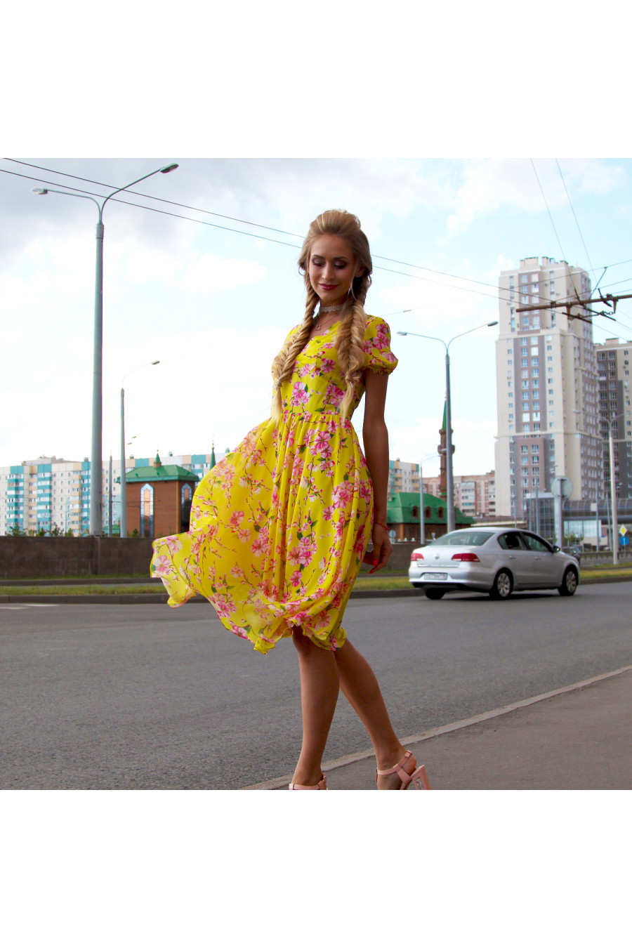 Легкое шифоновое платье с цветочным принтом, V - образный вырез, короткий рукав на резинке, широкий втачной пояс, расклешенная юбка на подкладке.