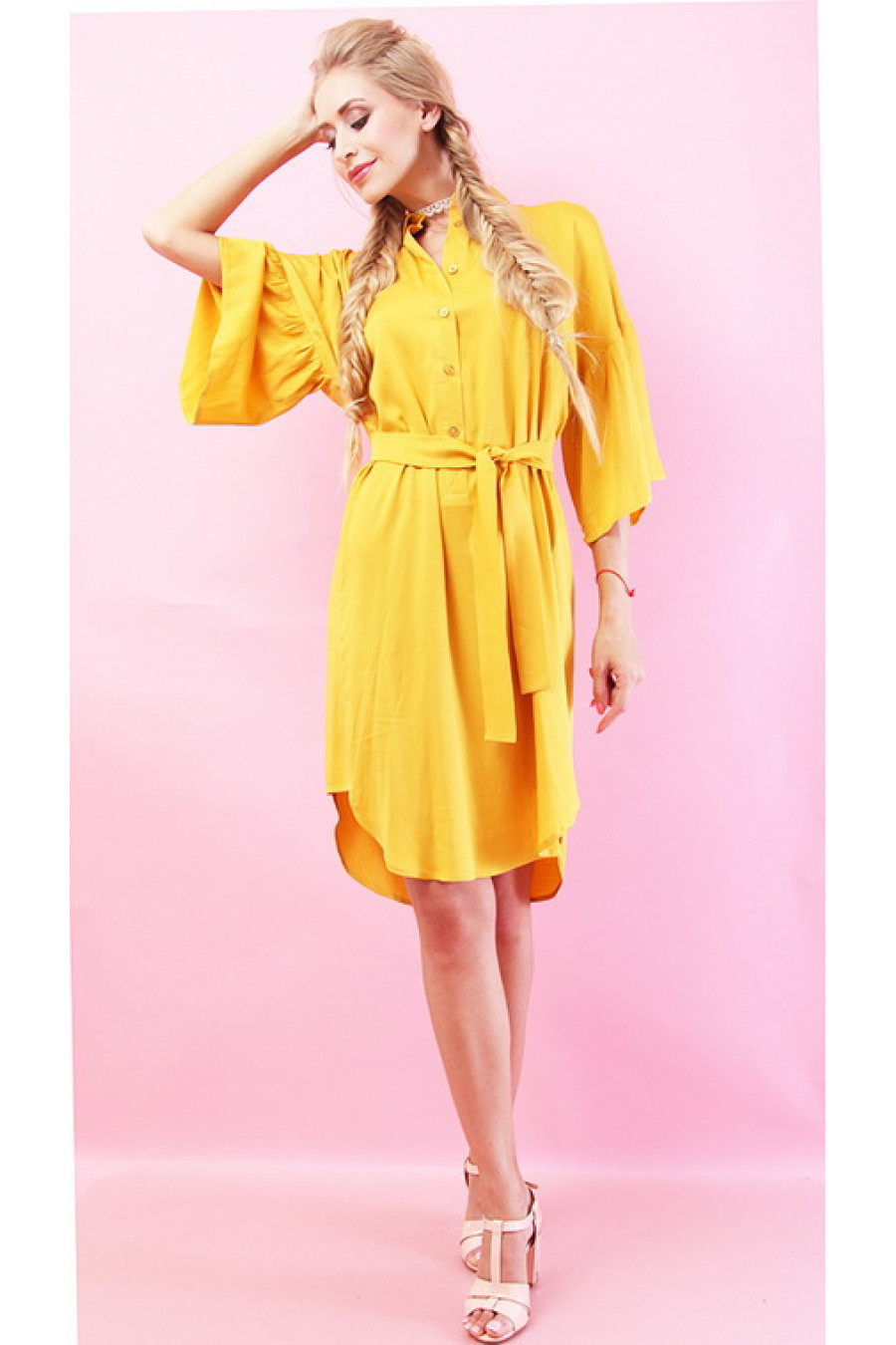 Яркое платье-туника свободного силуэта из тонкого хлопка с необычным рукавом 3/4, рубашечный воротник. В комплекте идет пояс.