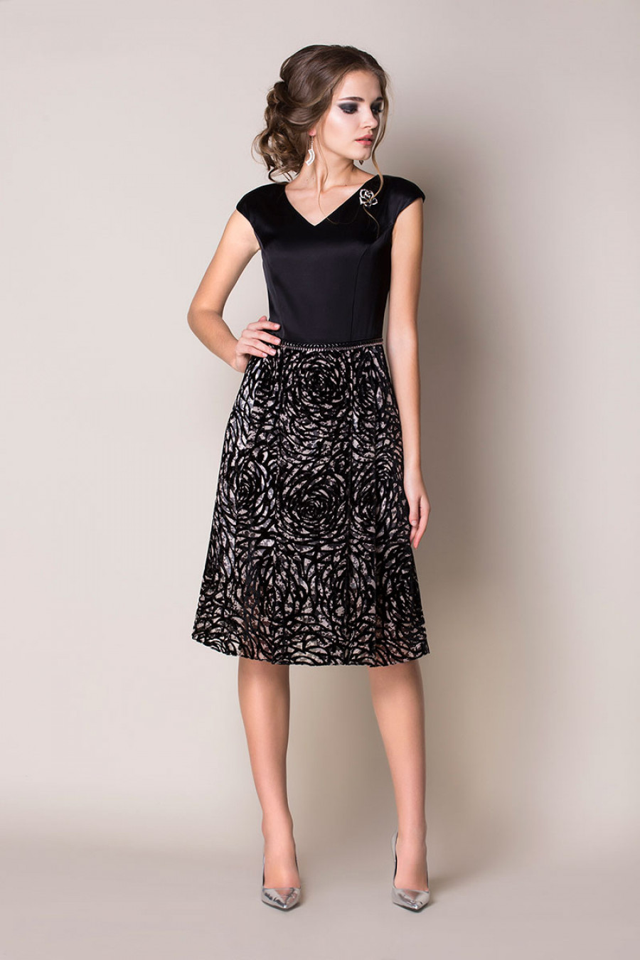 Платье отрезное по линии талии, на подкладке, сзади по спинке молния. Низ платья выполнен из сетки украшенной объемным рисунком из флока, что придает оригинальность изделию.