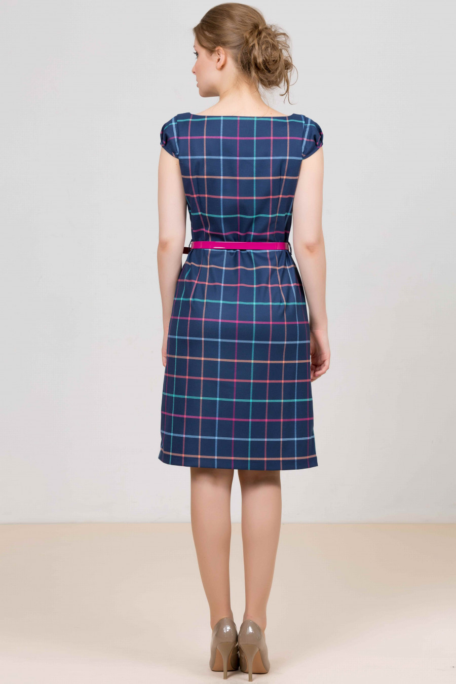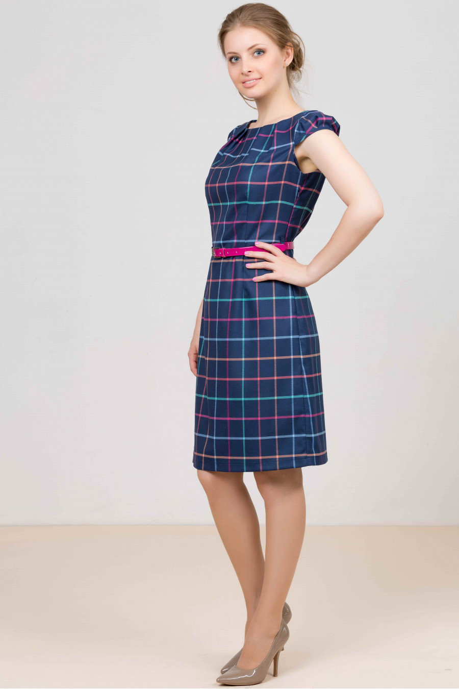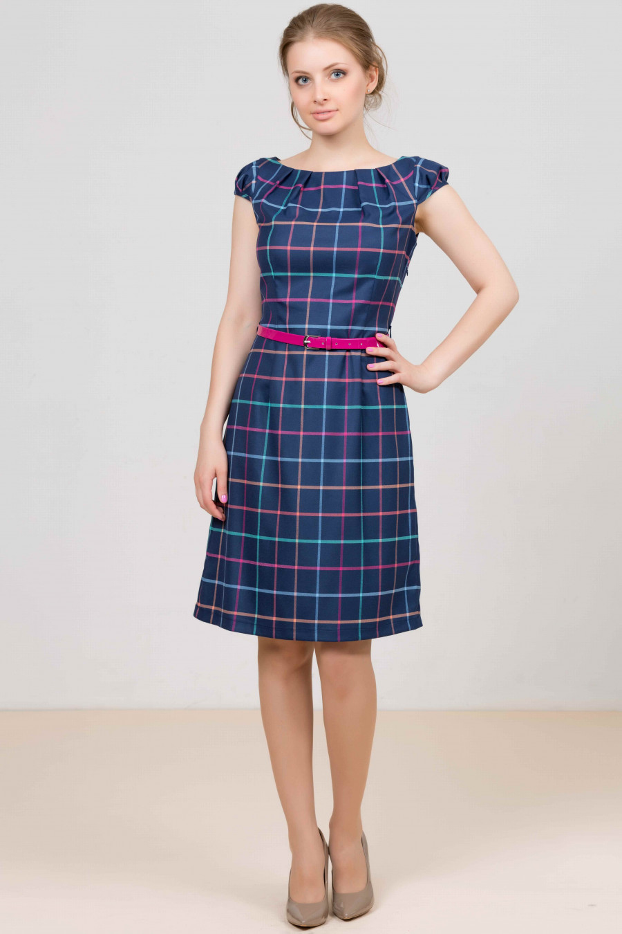 Платье с ремнем. Отличное платье на каждый день и для работы в офисе. Модель с короткими рукавами и округлым вырезом горловины. Оформлено изделие рисунком в клетку. Линию талии подчеркивает яркий ремень. Материал: джерси