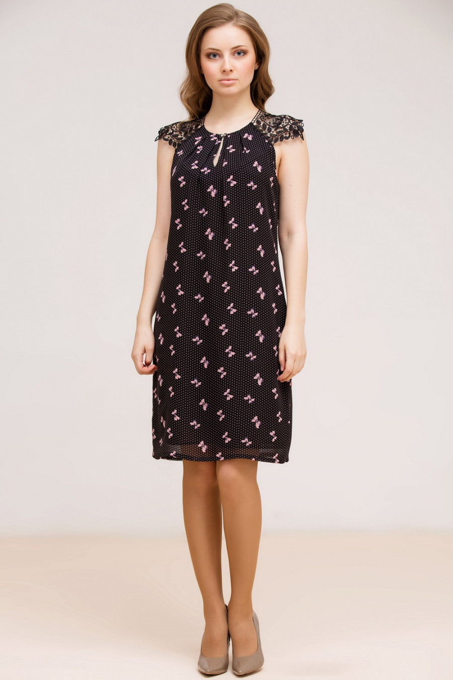 Платье с округлым вырезом горловины и короткими рукавами. Модель выполнена из легкого материала и украшена кружевом. Подкладка: 95% полиэстер, 5% эластан. Материал шифон+вставка.