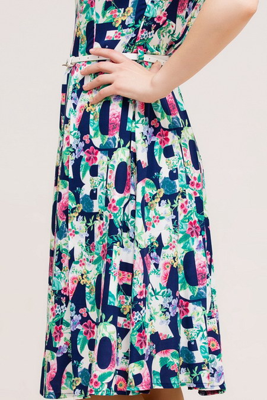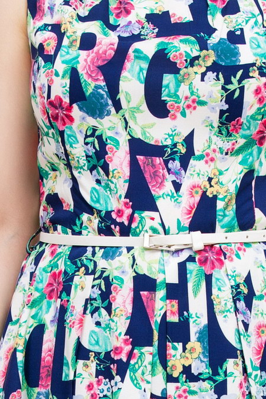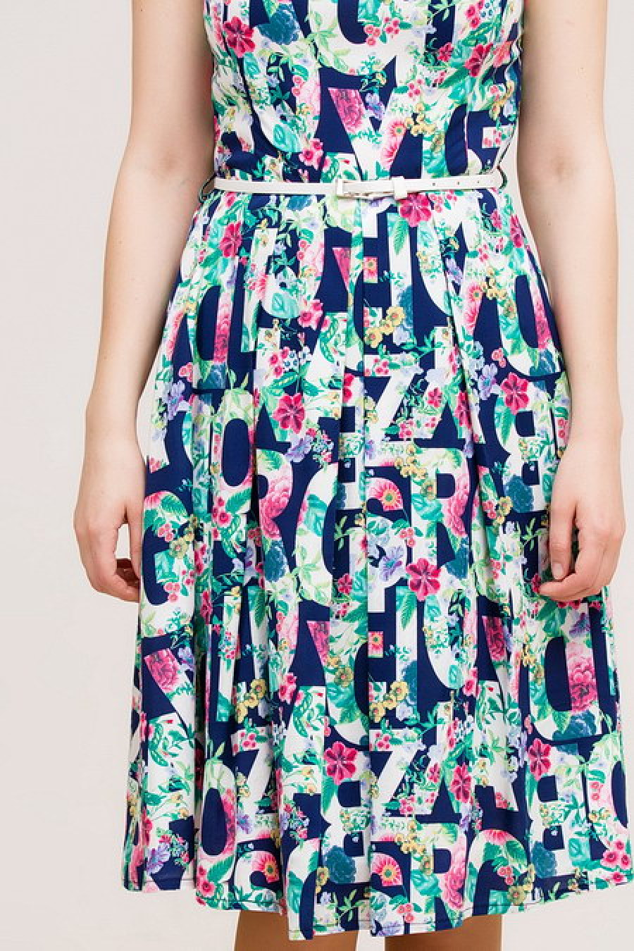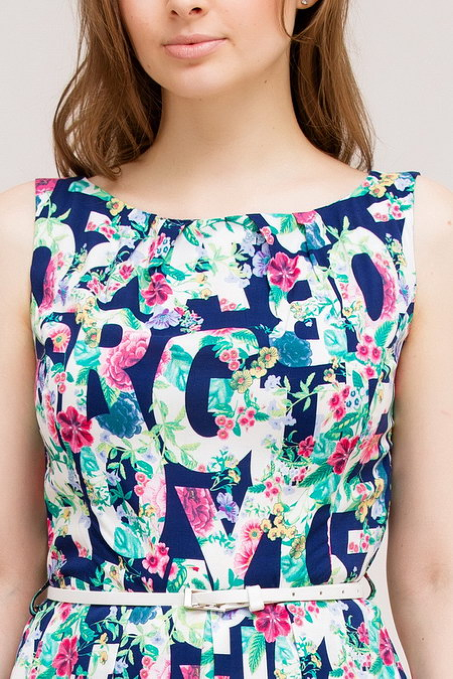 Платье с округлым вырезом горловины. Модель выполнена из легкого материала и украшена рисунком. Пояс входит в комплект.