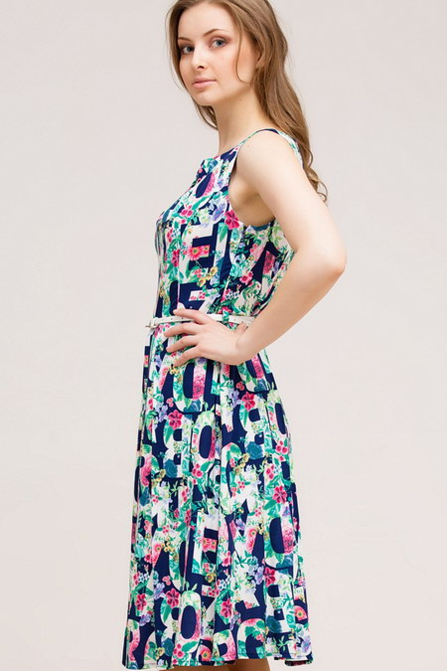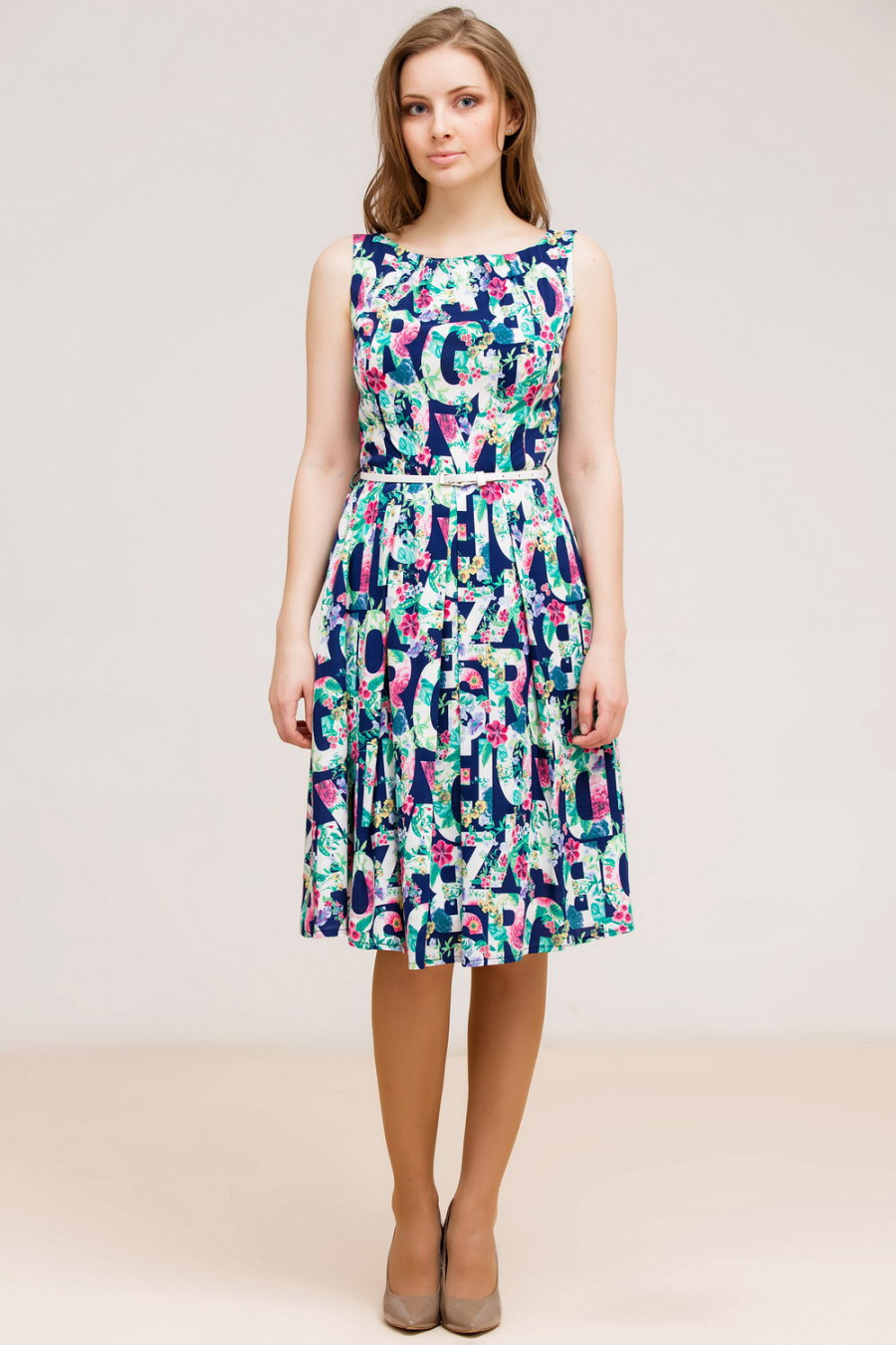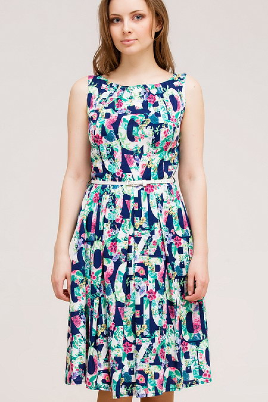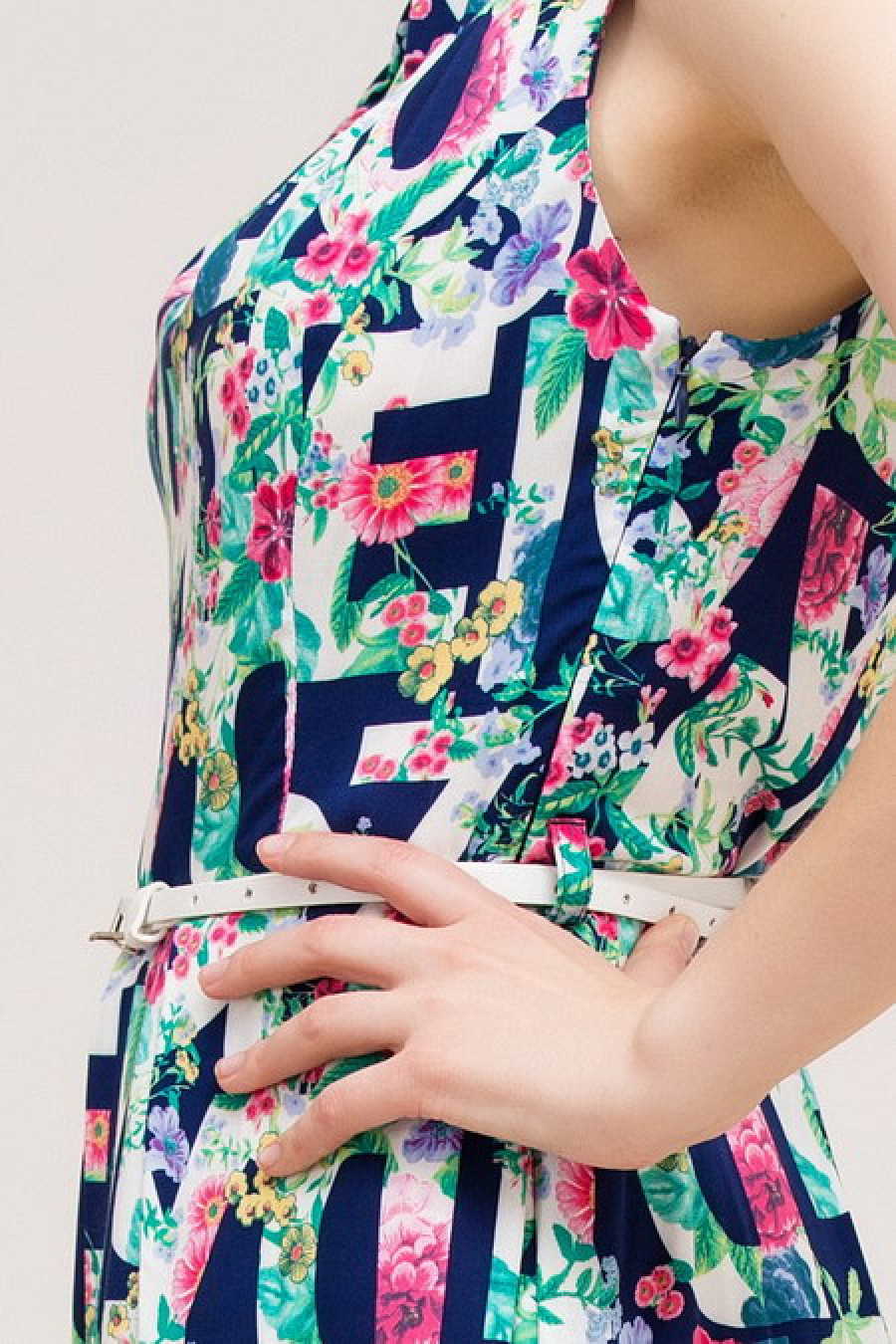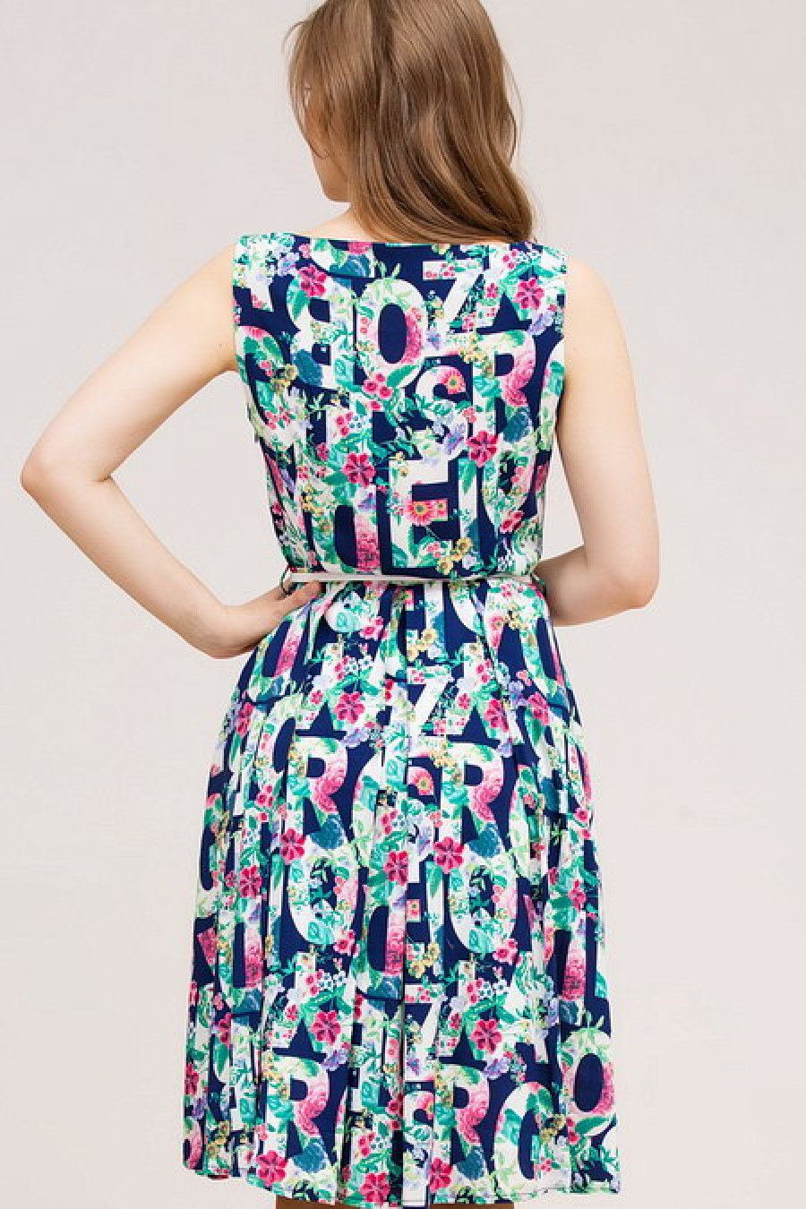 Платье с округлым вырезом горловины. Модель выполнена из легкого материала и украшена рисунком. Пояс входит в комплект.