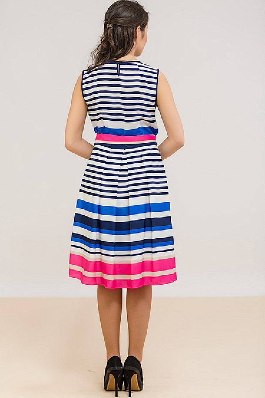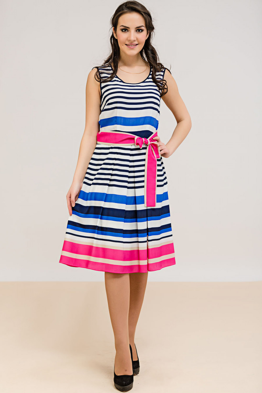 Платье в горизонтальную полосу без рукавов. Декорировано лентой, оформленной в бант на линии талии.