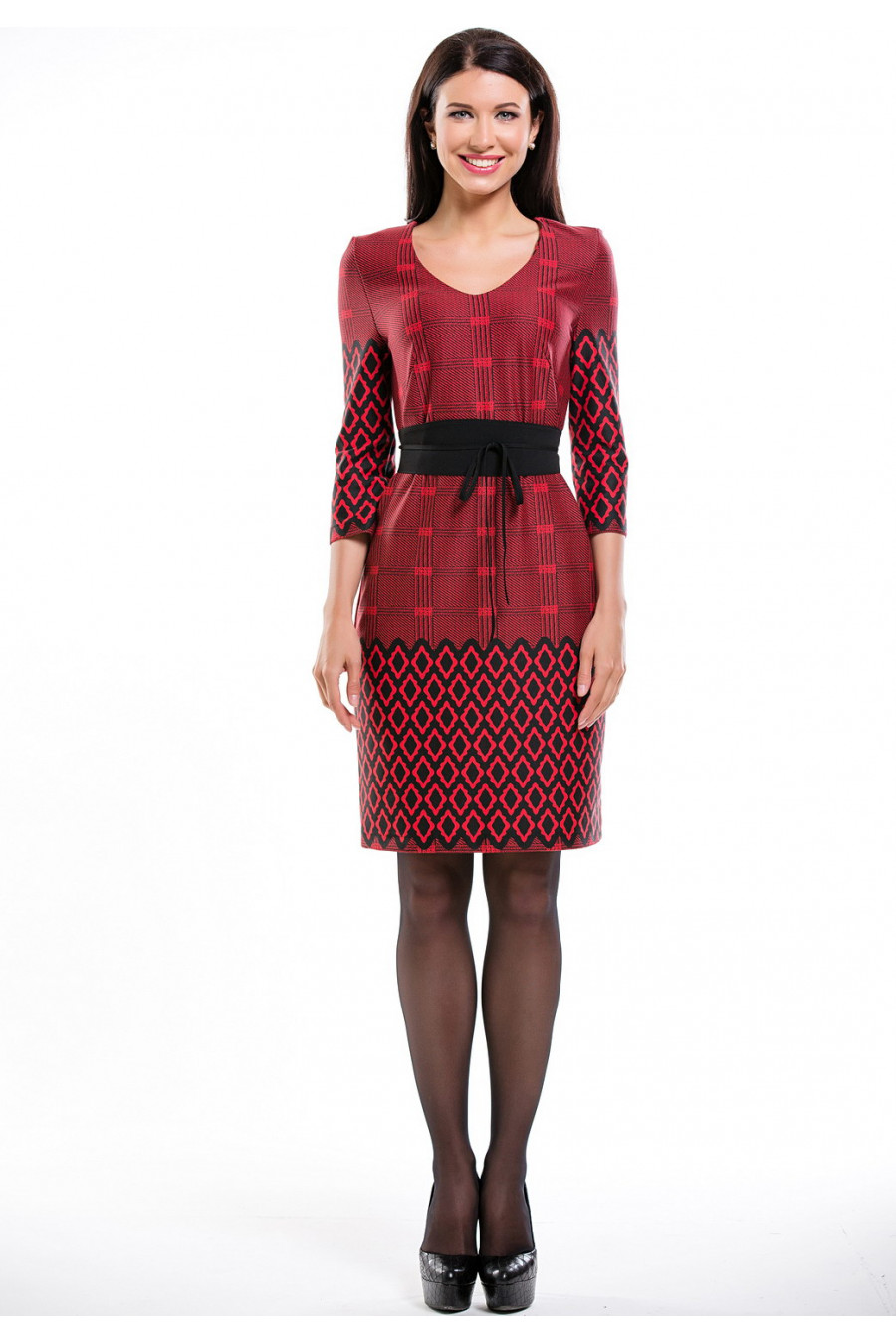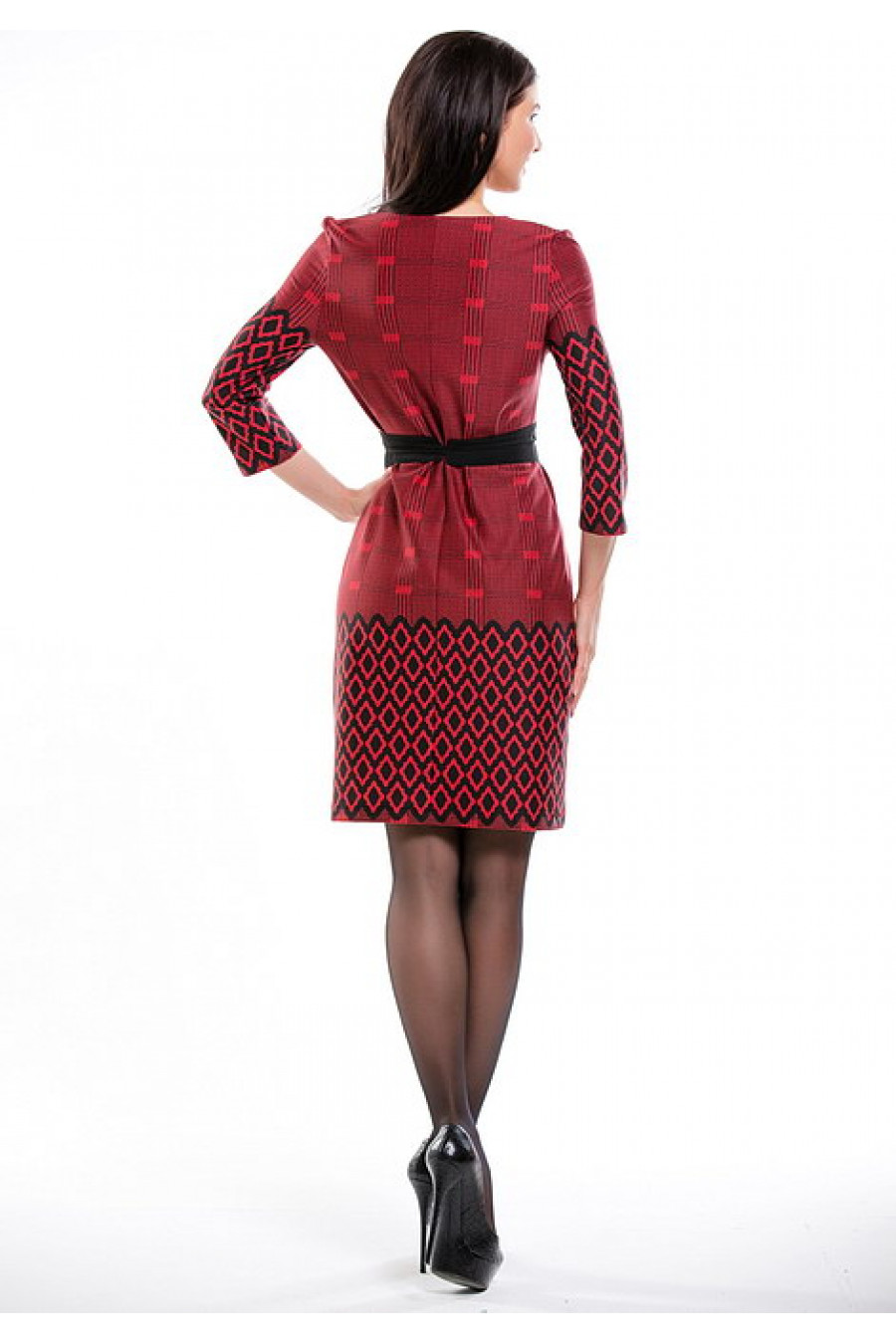 Приталенное платье с интересным орнаментом. Рукав 3/4, расширен книзу.