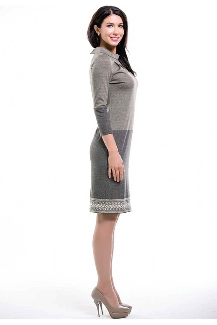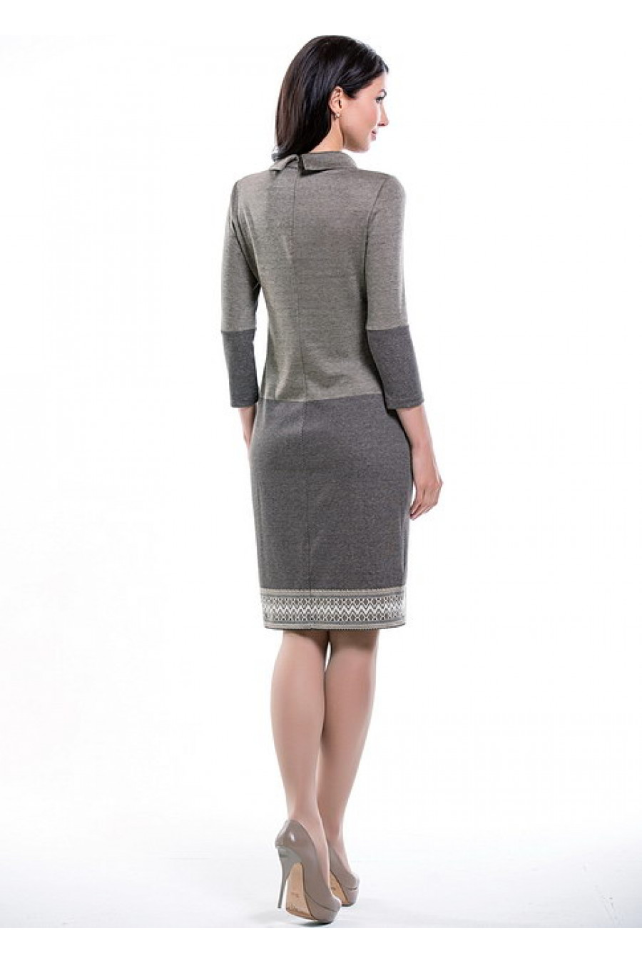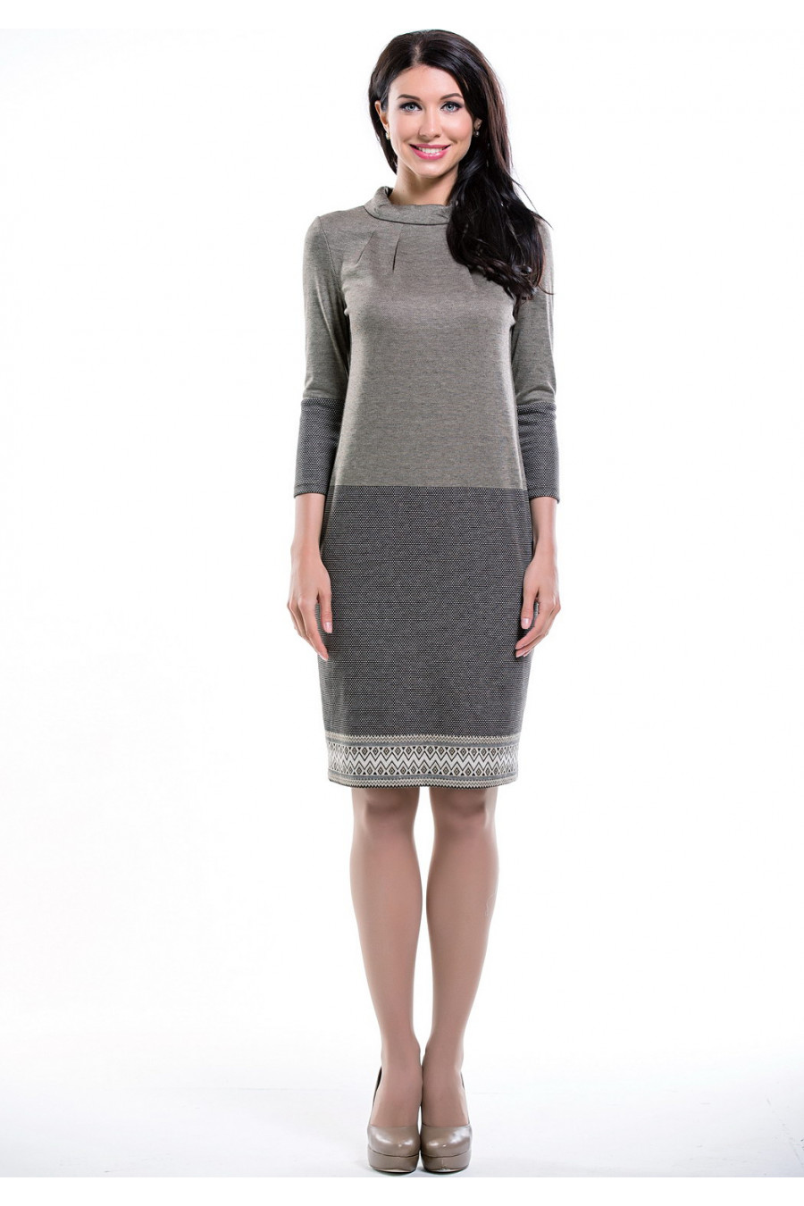 Прямое платье с рукавом 3/4 и воротником-стойкой.