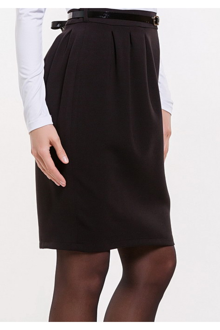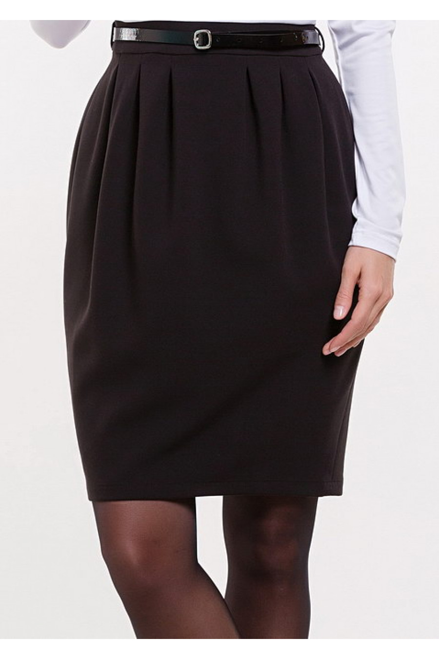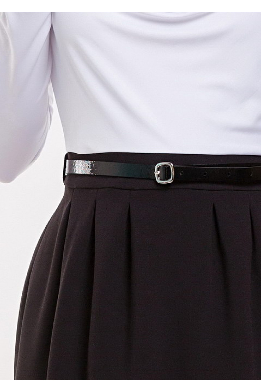 Комбинированное деловое платье с юбкой-тюльпаном и тонким черным поясом в комплекте.