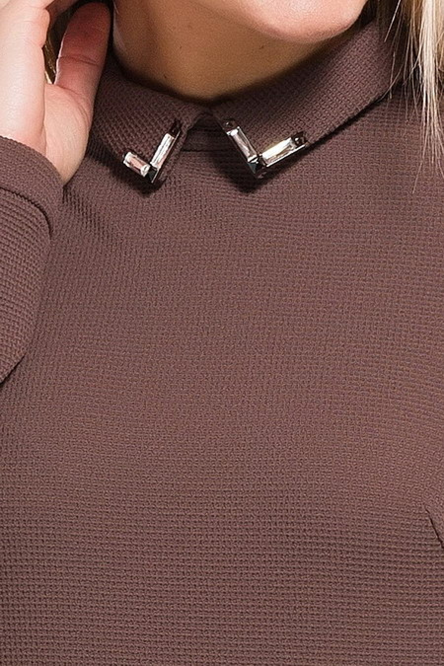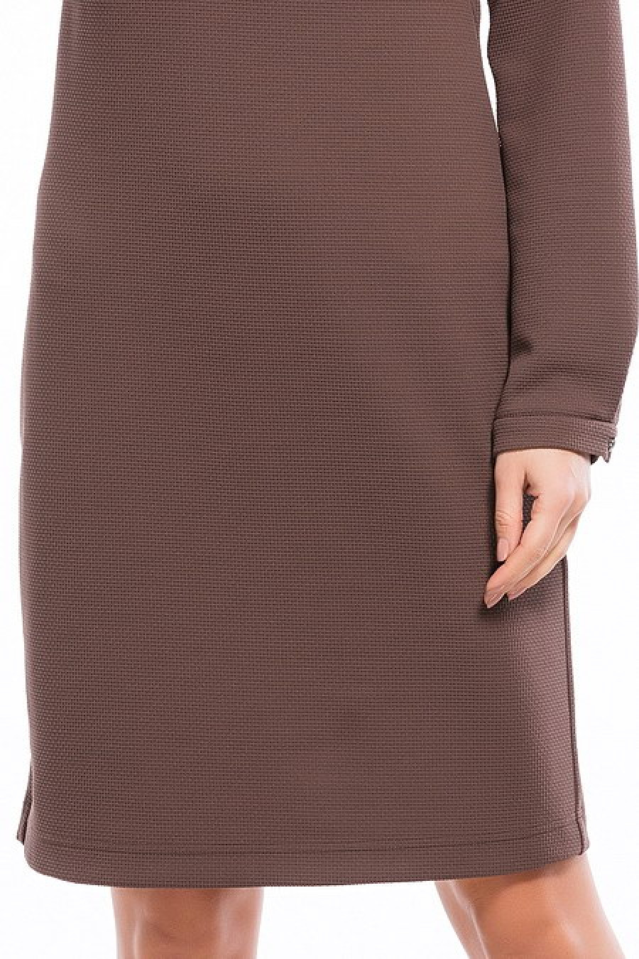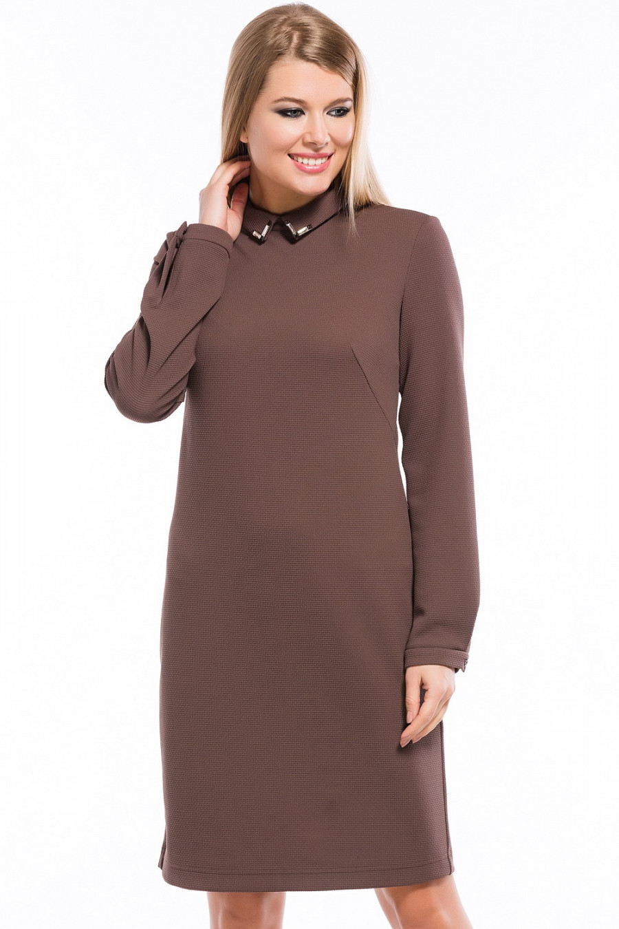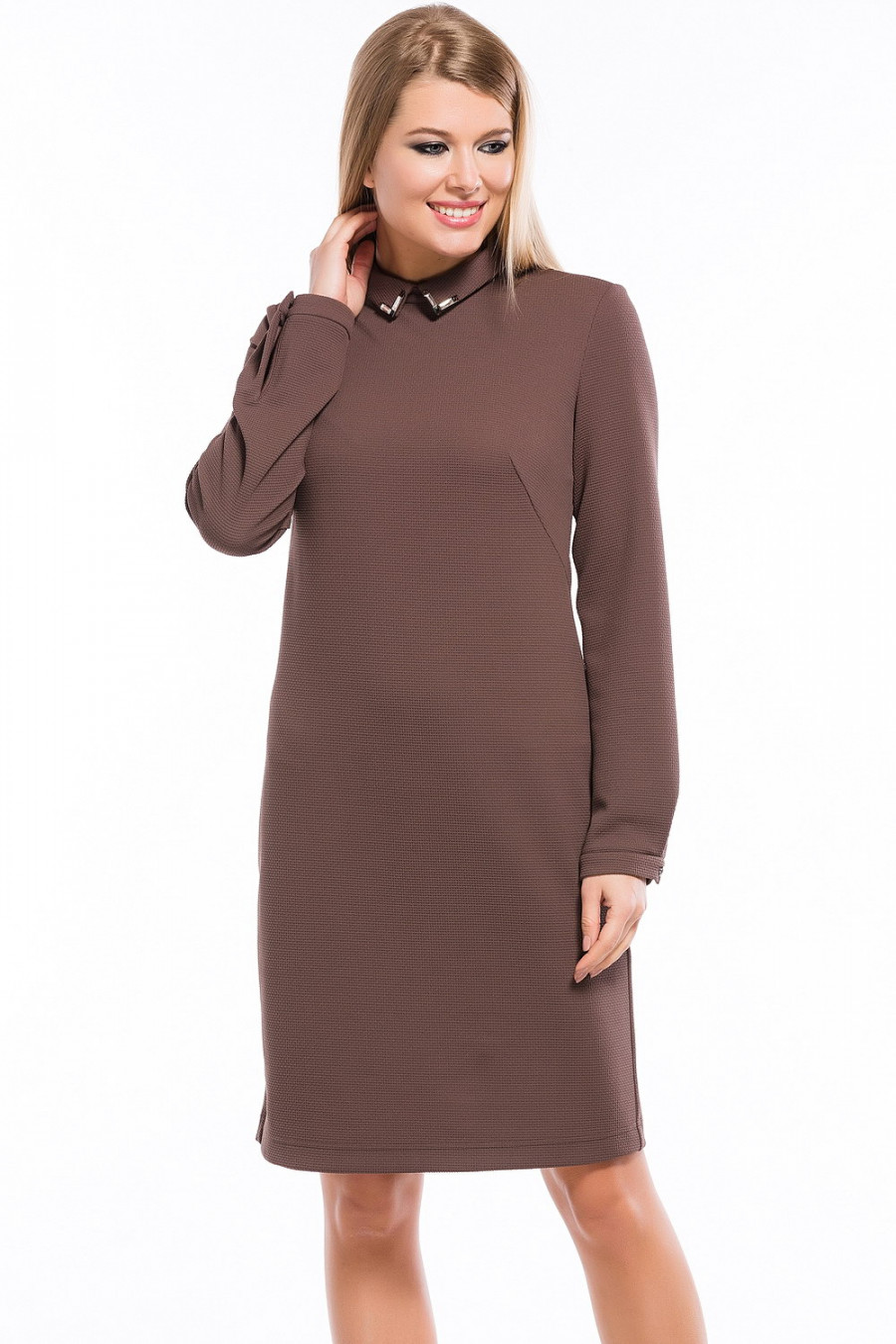 Стильное прямое платье из плотного трикотажа "диор" с длинным рукавом. Воротник-стойка украшен декоративными элементами. Платье будет одинаково уместо как в офисе, так и во время встреч с подругами.