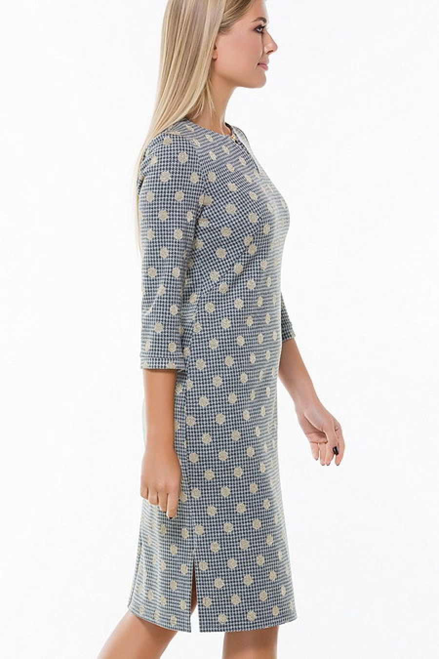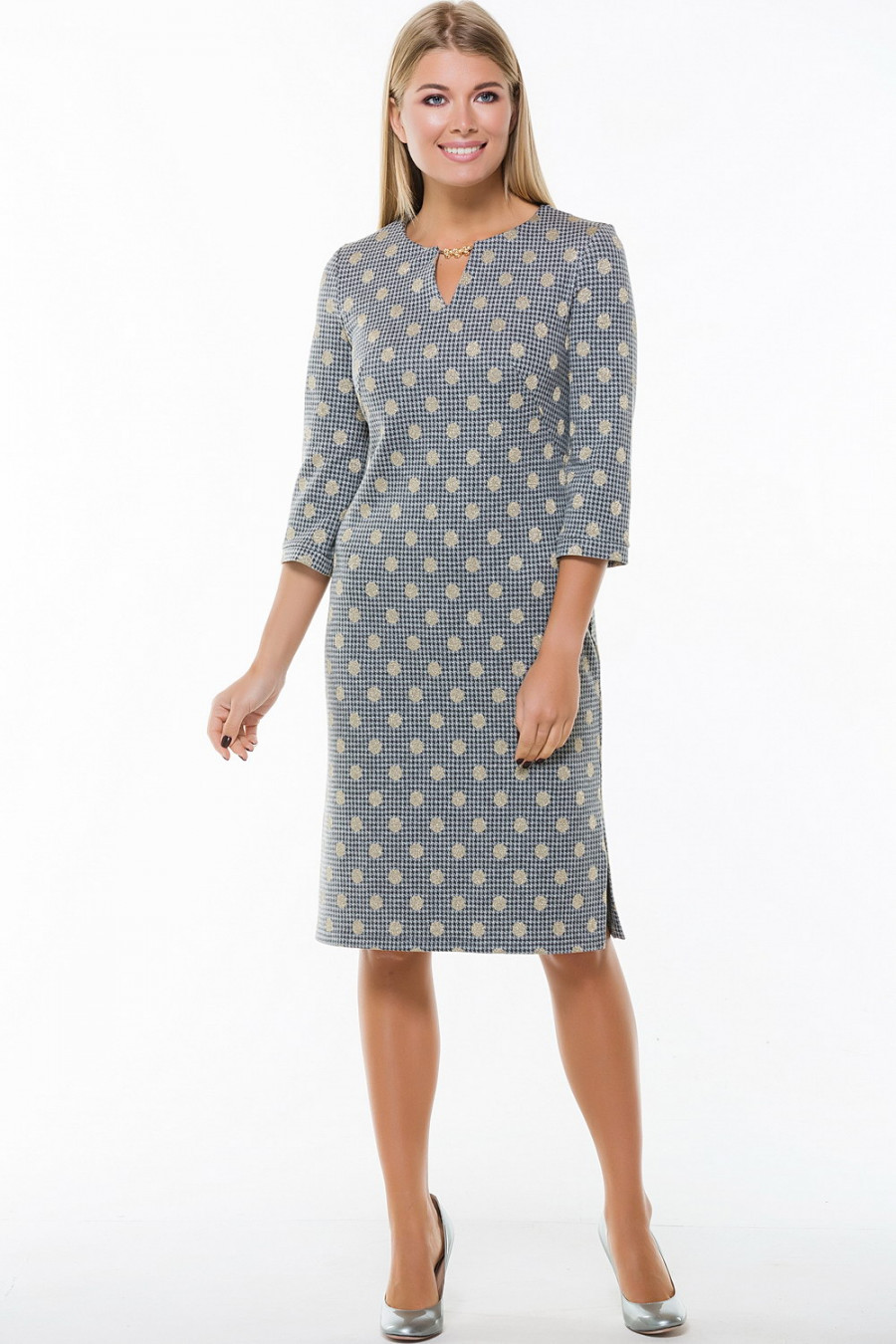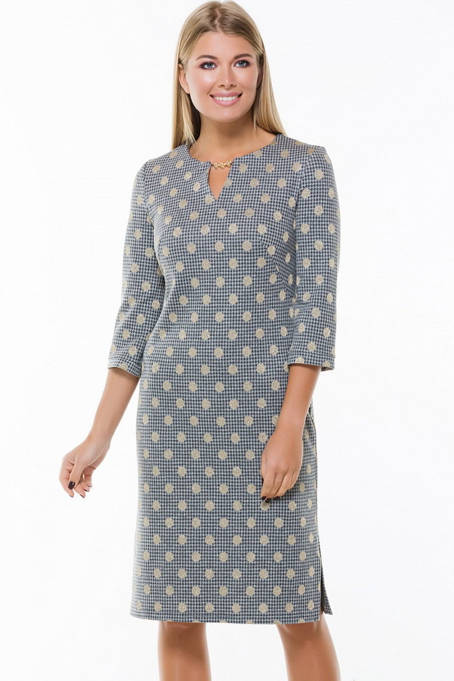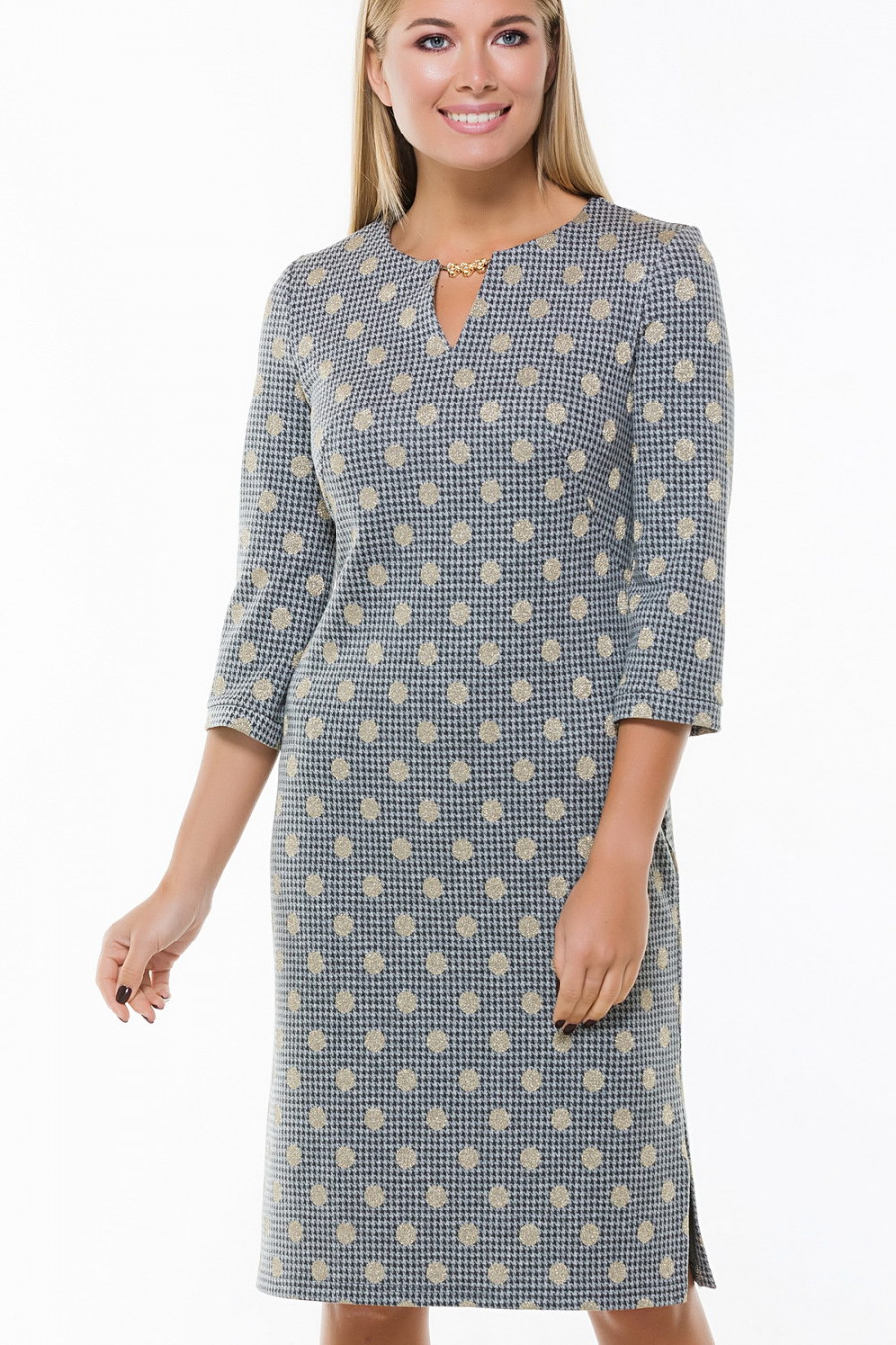 Стильное прямое платье с рукавом 3/4. Горло украшено декоративной цепочкой. По бокам подола разрезы.