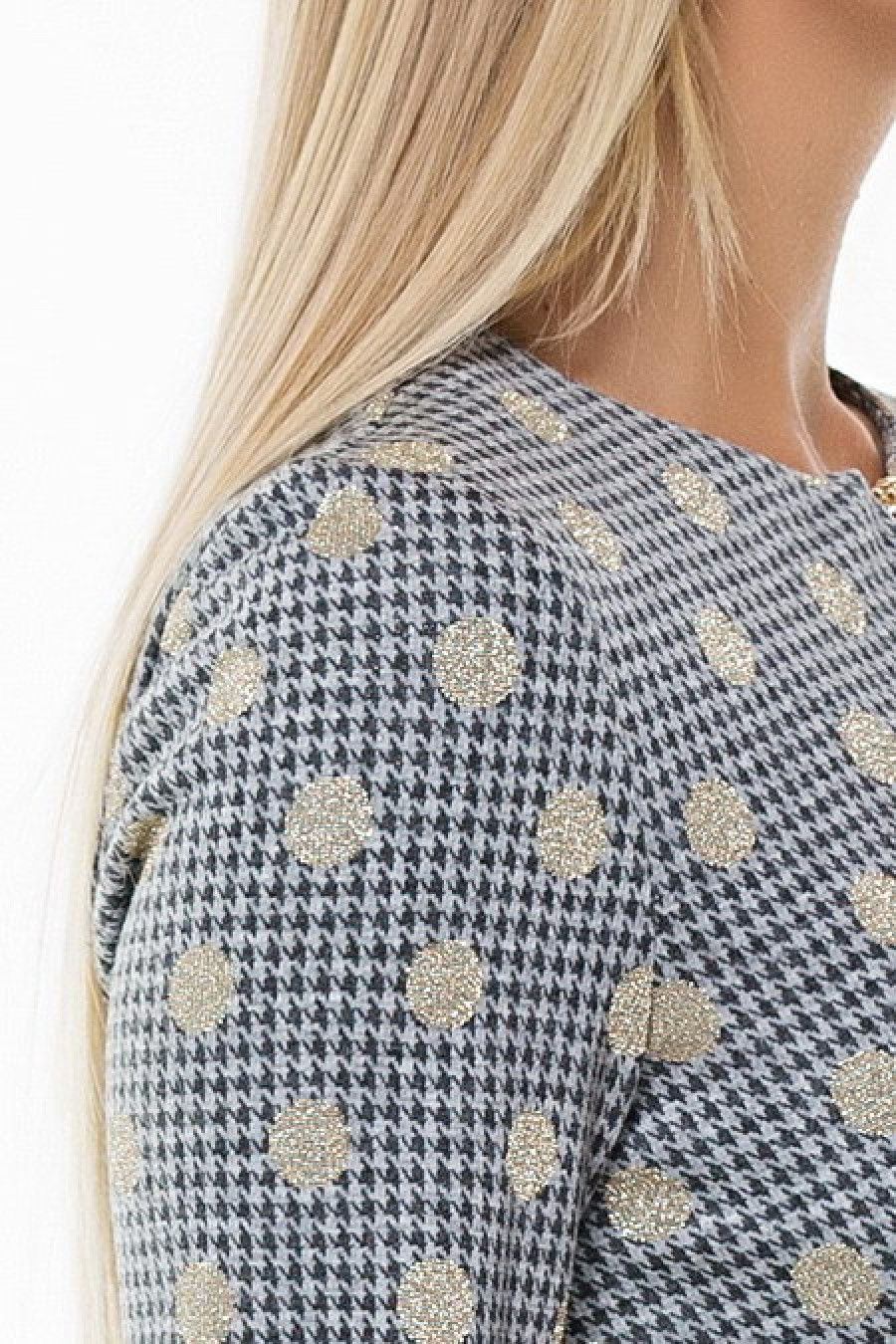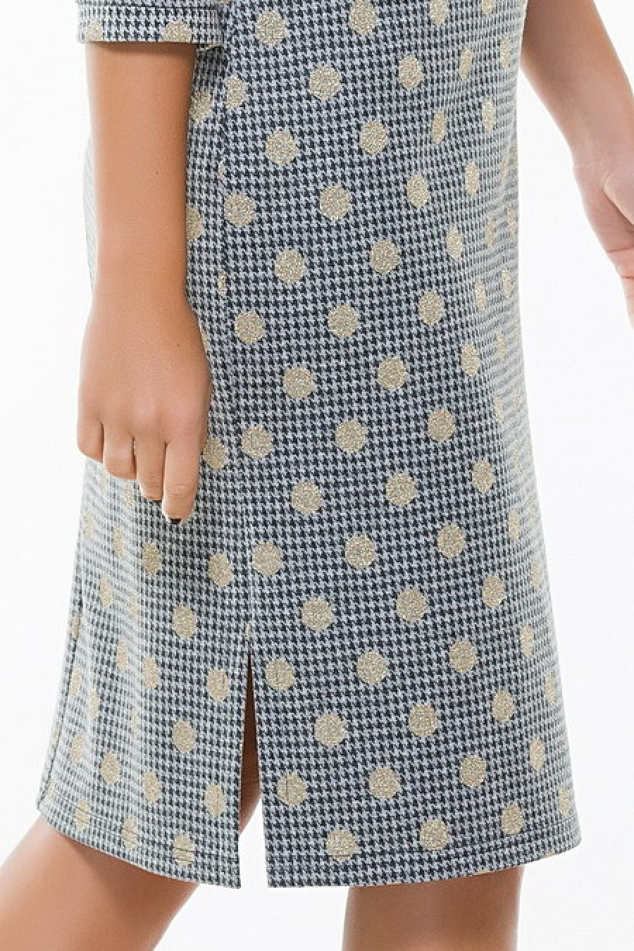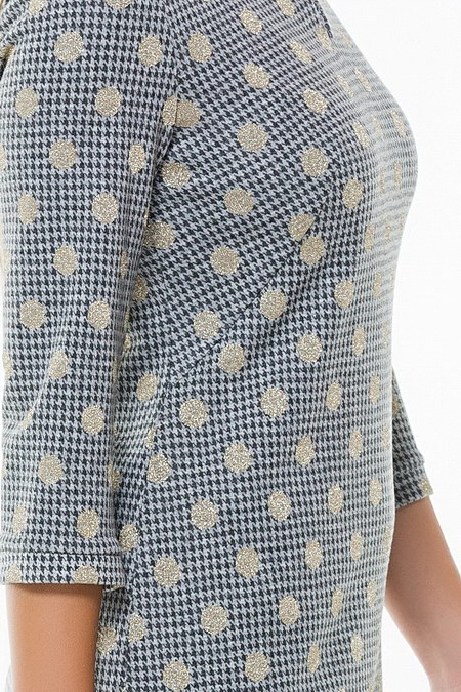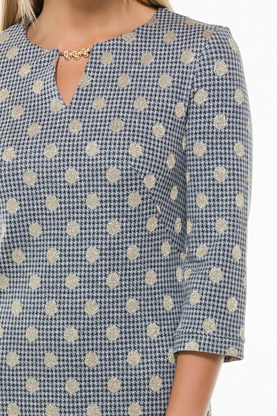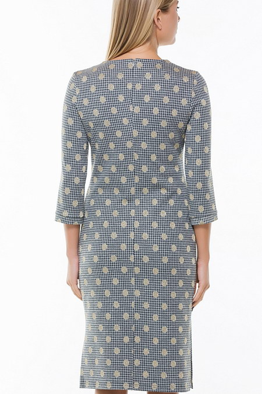 Стильное прямое платье с рукавом 3/4. Горло украшено декоративной цепочкой. По бокам подола разрезы.