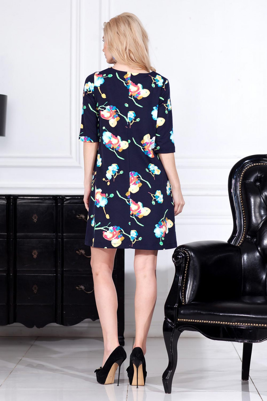 Платье из принтованного трикотажного полотна длиной до колена расклешеное с втачным рукавом 3/4. Карманы в боковых швах.