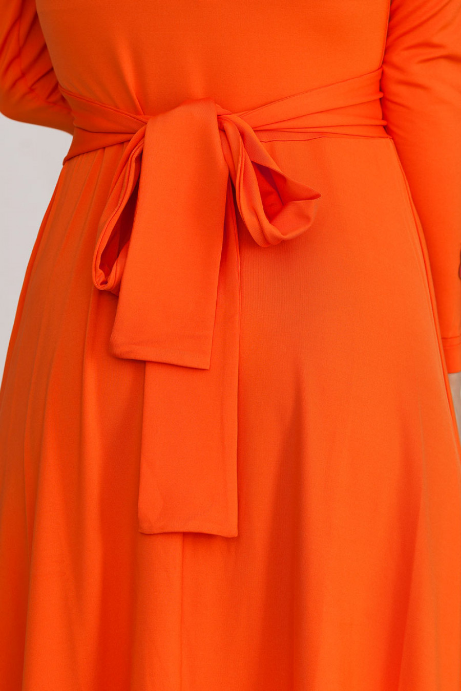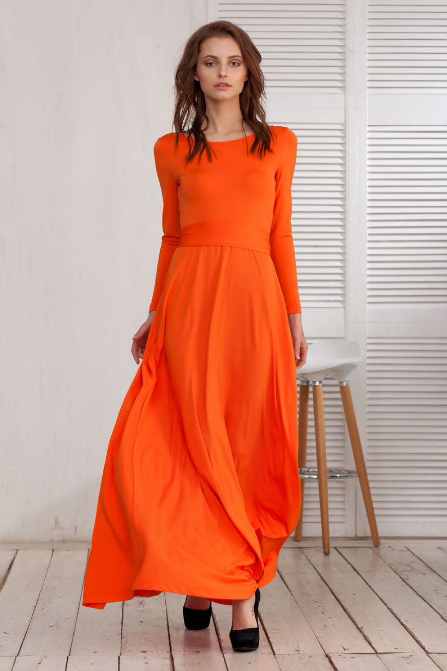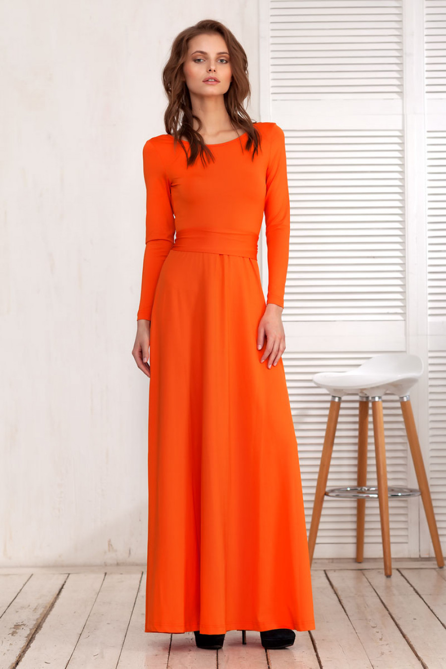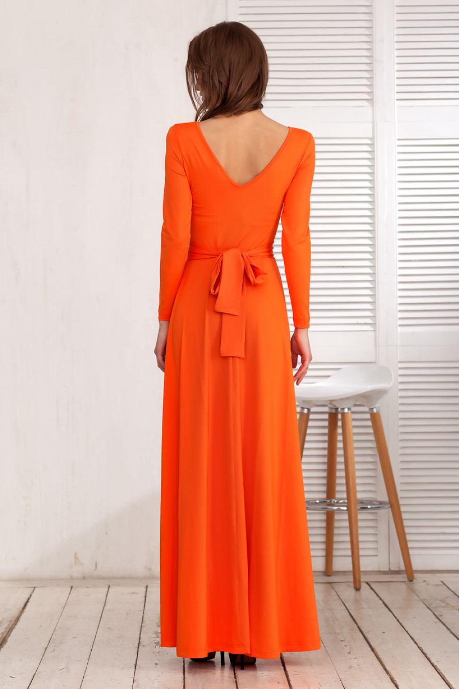 Элегантное платье из струящегося трикотажа длиной в пол с длинным рукавом. Сзади V-образный вырез горловины. На талии завязывается пояс.